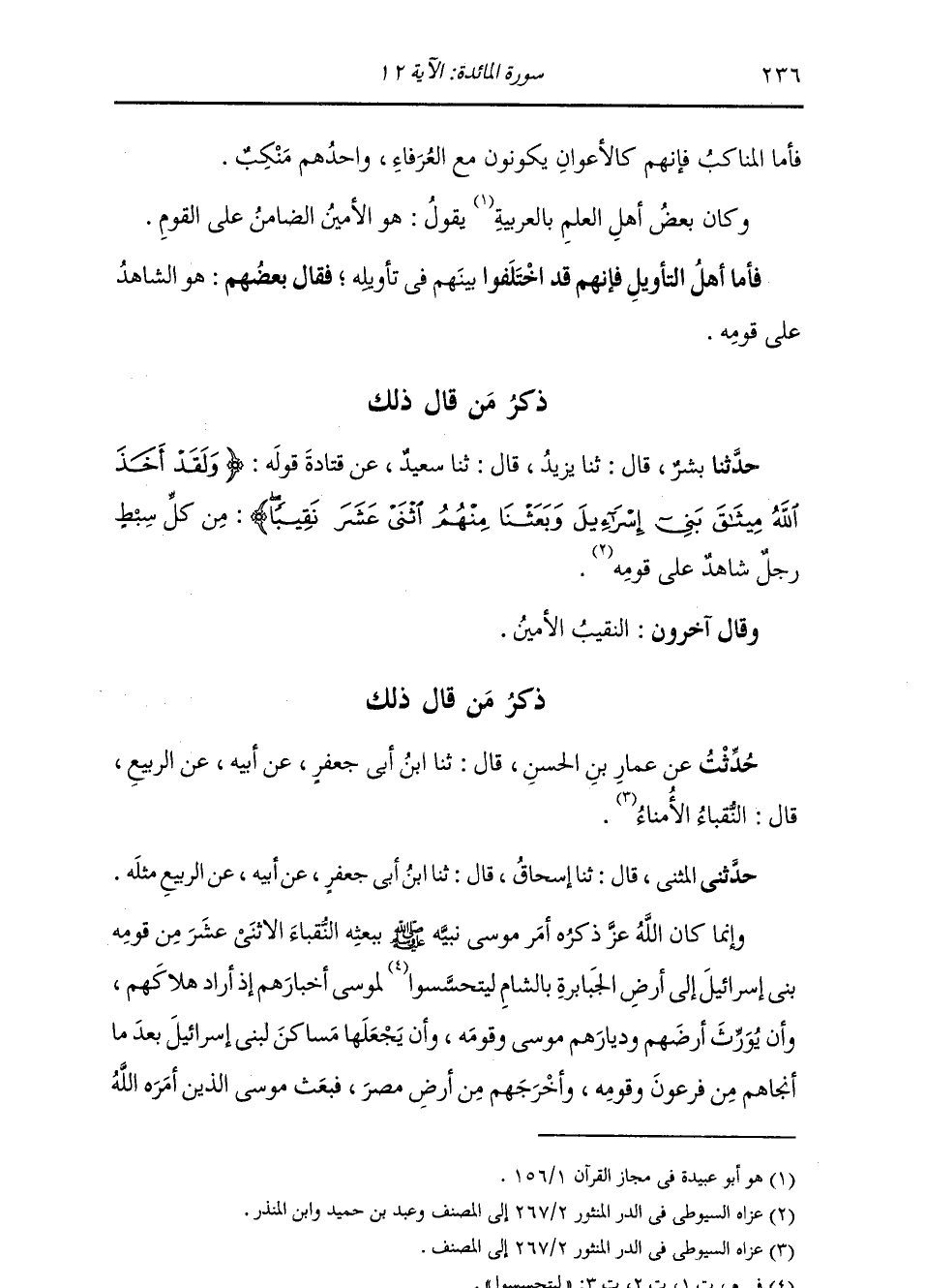 ذِكْرُ مَنْ قَالَ ذَلِكَ: حَدَّثَنَا بِشْرٌ , قَالَ: ثنا يَزِيدُ , قَالَ: ثنا سَعِيدٌ , عَنْ قَتَادَةَ , قَوْلُهُ: {§وَلَقَدْ أَخَذَ اللَّهُ مِيثَاقَ بَنِي إِسْرَائِيلَ وَبَعَثْنَا مِنْهُمُ اثْنَيْ عَشَرَ نَقِيبًا} [المائدة: 12] مِنْ كُلِّ سِبْطٍ رَجُلٌ شَاهِدٌ عَلَى قَوْمِهِ " وَقَالَ آخَرُونَ: النَّقِيبُ: الْأَمِينُ