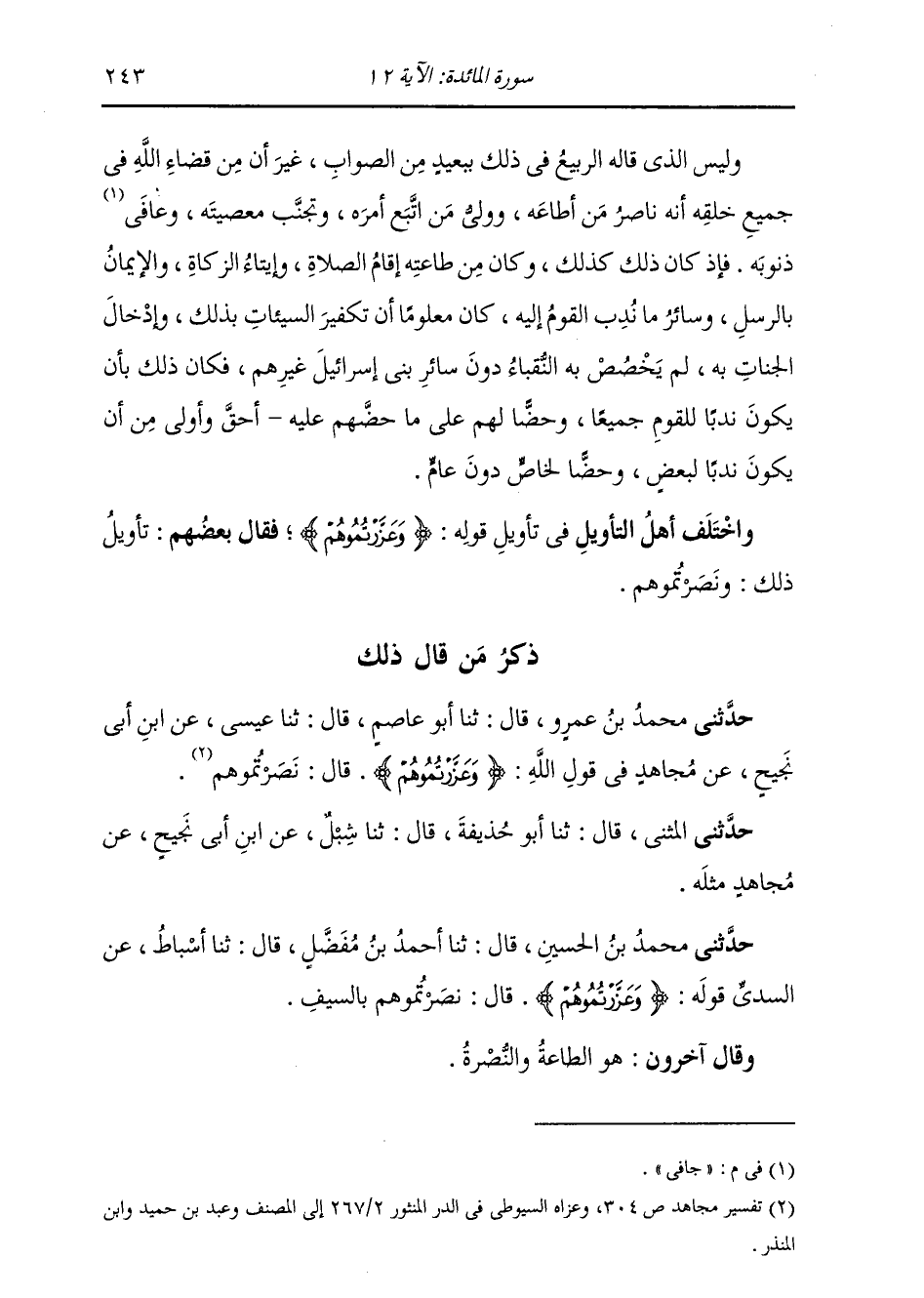 ذِكْرُ مَنْ قَالَ ذَلِكَ: حَدَّثَنِي مُحَمَّدُ بْنُ عَمْرٍو , قَالَ: ثنا أَبُو عَاصِمٍ , قَالَ: ثنا عِيسَى , عَنِ ابْنِ أَبِي نَجِيحٍ , عَنْ مُجَاهِدٍ , فِي قَوْلِ اللَّهِ: {§وَعَزَّرْتُمُوهُمْ} [المائدة: 12] قَالَ: «نَصَرْتُمُوهُمْ» حَدَّثَنِي الْمُثَنَّى قَالَ: ثنا أَبُو حُذَيْفَةَ , قَالَ: ثنا شِبْلٌ , عَنِ ابْنِ أَبِي نَجِيحٍ , عَنْ مُجَاهِدٍ , مِثْلَهُ