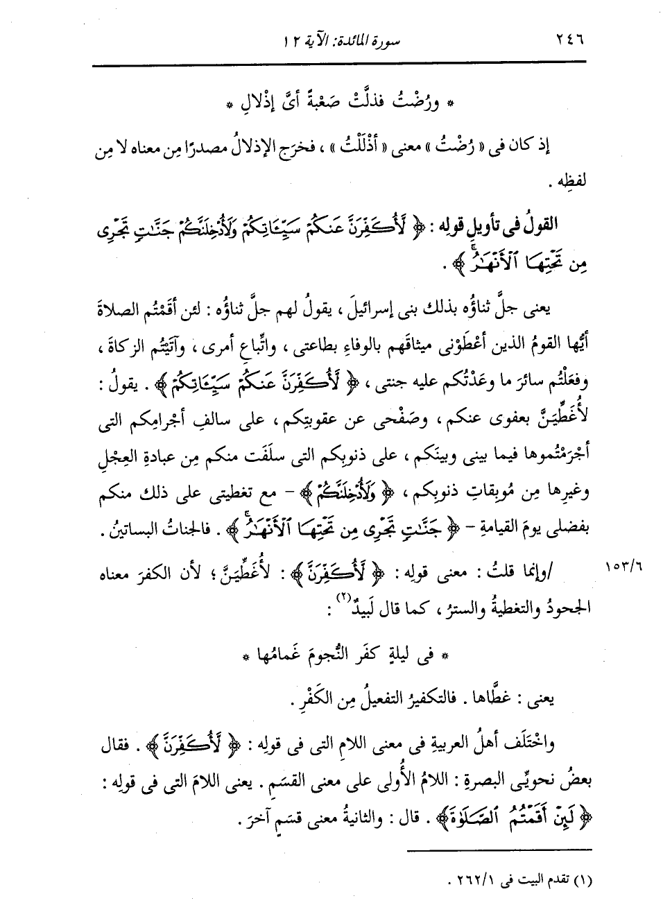 يَعْنِي: غَطَّاهَا. التَّفْعِيلُ مِنَ الْكُفْرِ وَاخْتَلَفَ أَهْلُ الْعَرَبِيَّةِ فِي مَعْنَى اللَّامِ الَّتِي فِي قَوْلِهِ: {لَأُكَفِّرَنَّ} [آل عمران: 195] فَقَالَ بَعْضُ نَحْوِيِّي الْبَصْرَةِ: اللَّامُ الْأُولَى عَلَى مَعْنَى الْقَسَمِ , يَعْنِي اللَّامَ الَّتِي فِي قَوْلِهِ: {لَئِنْ أَقَمْتُمُ الصَّلَاةَ} [المائدة: 12] قَالَ: " وَالثَّانِيَةُ مَعْنَى قَسَمٍ آخَرَ