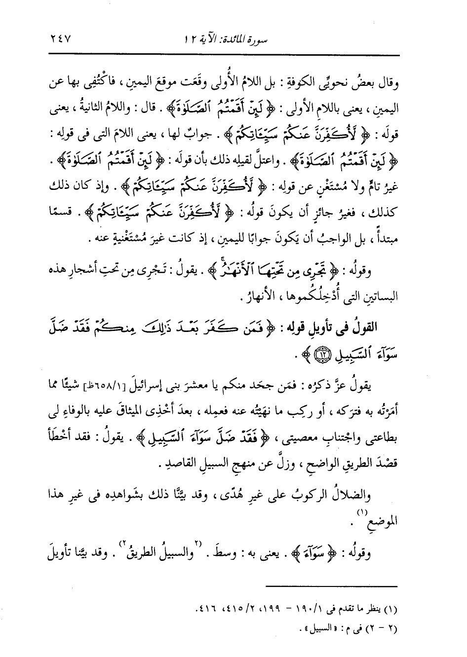 §الْقَوْلُ فِي تَأْوِيلِ قَوْلِهِ تَعَالَى: {فَمَنْ كَفَرَ بَعْدَ ذَلِكَ مِنْكُمْ فَقَدْ ضَلَّ سَوَاءَ السَّبِيلِ} [المائدة: 12] يَقُولُ عَزَّ ذِكْرُهُ: فَمَنْ جَحَدَ مِنْكُمْ يَا مَعْشَرَ بَنِي إِسْرَائِيلَ شَيْئًا مِمَّا أَمَرْتُهُ بِهِ , فَتَرَكَهُ , أَوْ رَكِبَ مَا نَهَيْتُهُ عَنْهُ فَعَمِلَهُ بَعْدَ أَخْذِي الْمِيثَاقَ عَلَيْهِ بِالْوَفَاءِ لِي بِطَاعَتِي وَاجْتِنَابِ مَعْصِيَتِي {فَقَدْ ضَلَّ سَوَاءَ السَّبِيلِ} [البقرة: 108] يَقُولُ: " فَقَدْ أَخْطَأَ قَصْدَ الطَّرِيقِ الْوَاضِحِ , وَزَلَّ عَنْ مَنْهَجِ السَّبِيلِ الْقَاصِدِ. وَالضَّلَالُ: الرُّكُوبُ عَلَى غَيْرِ هُدًى؛ وَقَدْ بَيَّنَّا ذَلِكَ بِشَاهِدِهِ فِي غَيْرِ هَذَا الْمَوْضِعِ. وَقَوْلُهُ: {سَوَاءَ} [البقرة: 6] يَعْنِي بِهِ: وَسَطَ السَّبِيلِ , وَقَدْ بَيَّنَّا تَأْوِيلَ -[248]- ذَلِكَ كُلَّهُ فِي غَيْرِ هَذَا الْمَوْضِعِ , فَأَغْنَى عَنْ إِعَادَتِهِ فِي هَذَا الْمَوْضِعِ