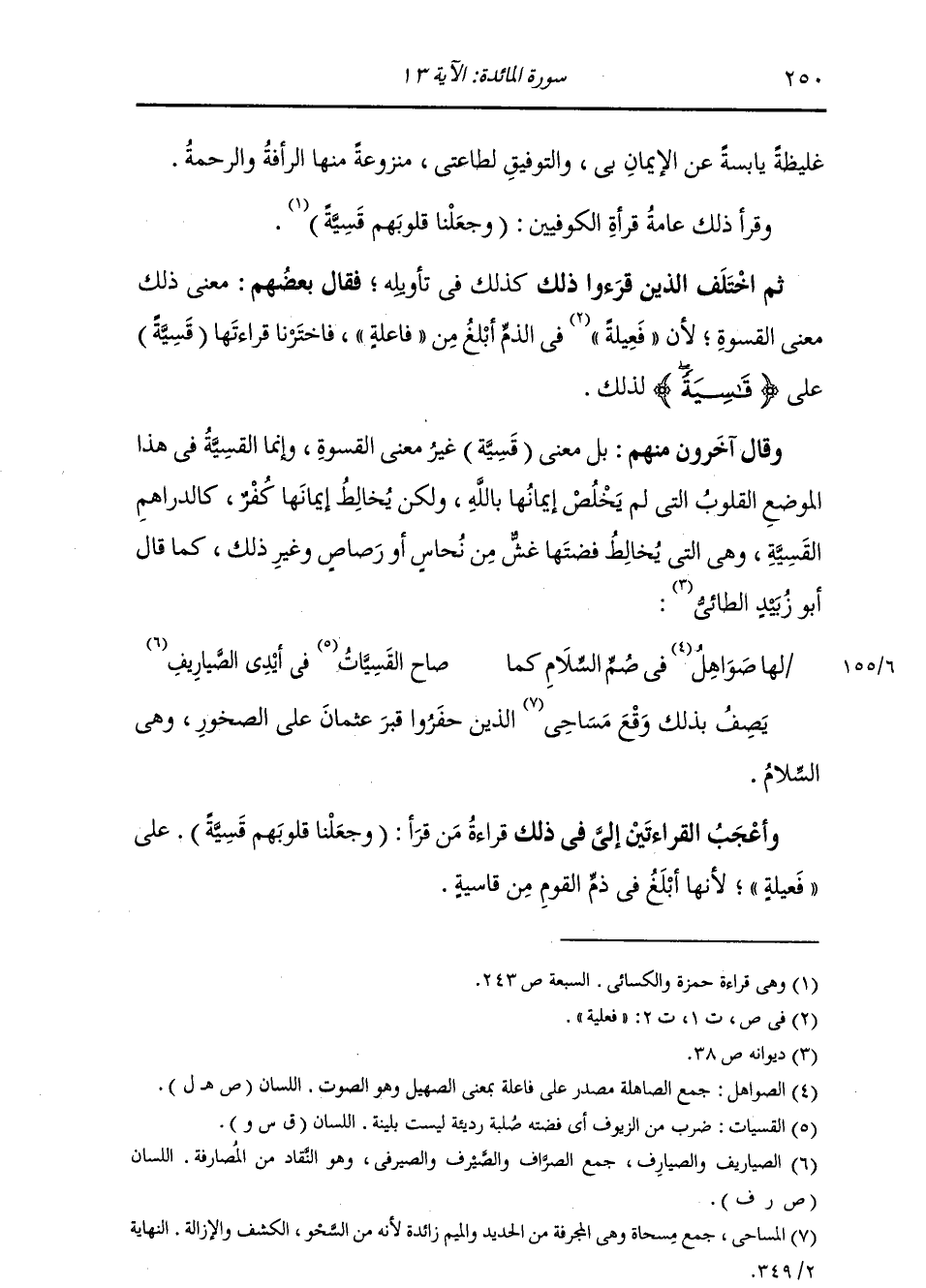 يَصِفُ بِذَلِكَ وَقْعَ مَسَاحِي الَّذِينَ حَفَرُوا قَبْرَ عُثْمَانَ عَلَى الصُّخُورِ , وَهِيَ السِّلَامُ. وَأَعْجَبُ الْقِرَاءَتَيْنِ إِلَيَّ فِي ذَلِكَ قِرَاءَةُ مَنْ قَرَأَ: «وَجَعَلْنَا قُلُوبَهُمْ قَسِيَّةً» عَلَى فَعِيلَةٍ , لِأَنَّهَا أَبْلَغُ فِي ذَمِّ الْقَوْمِ مِنْ قَاسِيَةٍ "