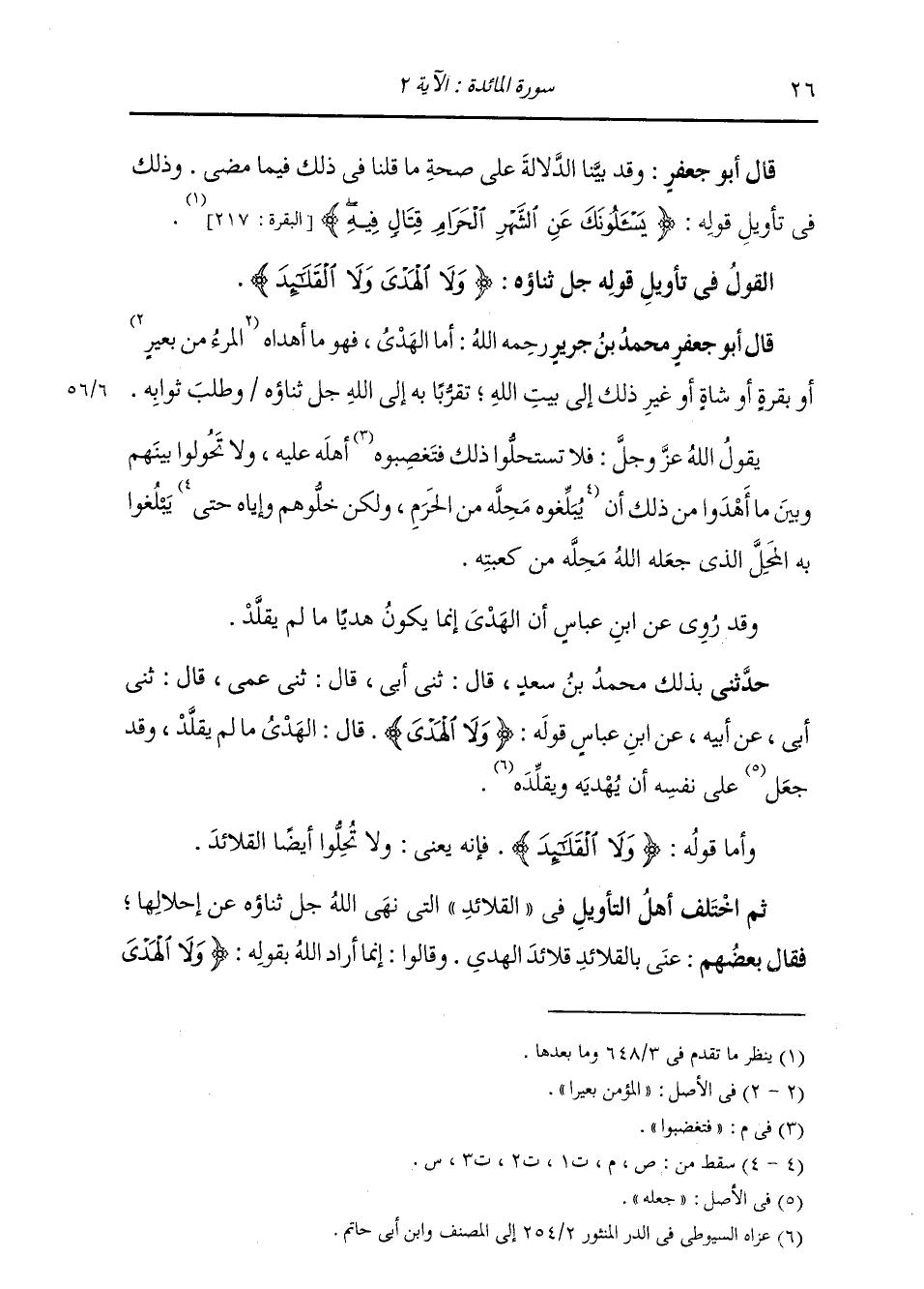 §الْقَوْلُ فِي تَأْوِيلِ قَوْلِهِ تَعَالَى: {وَلَا الْهَدْيَ وَلَا الْقَلَائِدَ} [المائدة: 2] أَمَّا الْهَدْي: فَهُوَ مَا أَهْدَاهُ الْمَرْءُ مِنْ بَعِيرٍ أَوْ بَقَرَةٍ أَوْ شَاةٍ أَوْ غَيْرِ ذَلِكَ إِلَى بَيْتِ اللَّهِ , تَقَرُّبًا بِهِ إِلَى اللَّهِ وَطَلَبَ ثَوَابِهِ. يَقُولُ اللَّهُ عَزَّ وَجَلَّ: فَلَا تَسْتَحِلُّوا ذَلِكَ فَتُغْضِبُوا أَهْلَهُ عَلَيْهِ , وَلَا تَحُولُوا بَيْنَهُمْ وَبَيْنَ مَا أَهْدَوْا مِنْ ذَلِكَ أَنْ يَبْلُغُوا بِهِ الْمَحِلَّ الَّذِي جَعَلَهُ اللَّهُ مَحِلَّهُ مِنْ كَعْبَتِهِ. وَقَدْ رُوِيَ عَنِ ابْنِ عَبَّاسٍ: أَنَّ الْهَدْيَ إِنَّمَا يَكُونُ هَدْيًا مَا لَمْ يُقَلَّدْ "