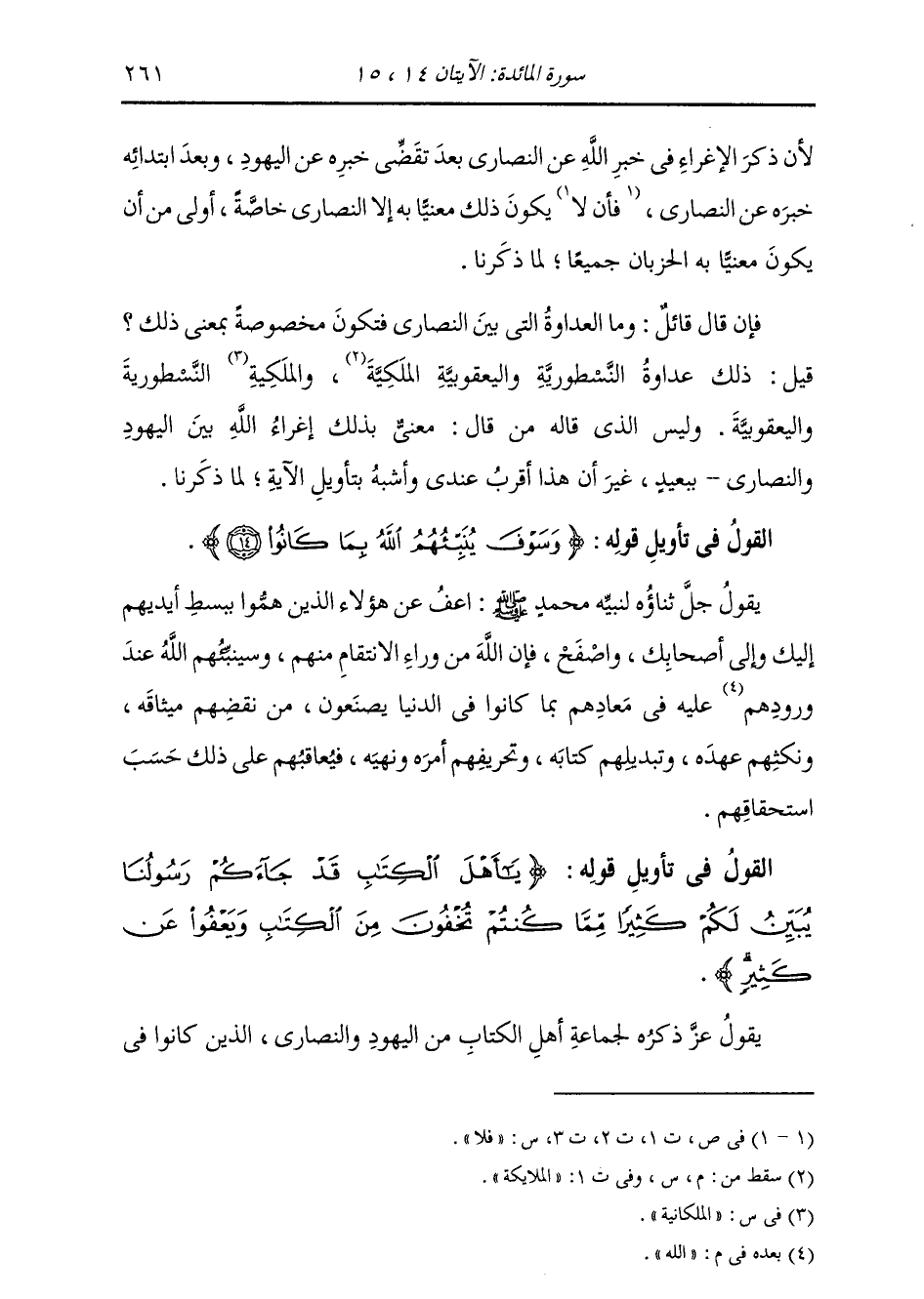 لِأَنَّ ذِكْرَ الْإِغْرَاءِ فِي خَبَرِ اللَّهِ عَنِ النَّصَارَى بَعْدَ تَقَضِّي خَبَرِهِ عَنِ الْيَهُودِ , وَبَعْدَ ابْتِدَائِهِ خَبَرَهُ عَنِ النَّصَارَى , فَأَنْ لَا يَكُونَ ذَلِكَ مَعْنِيًّا بِهِ إِلَّا النَّصَارَى خَاصَّةً أَوْلَى مِنْ أَنْ يَكُونَ مَعْنِيًّا بِهِ الْحِزْبَانِ جَمِيعًا لِمَا ذَكَرْنَا. فَإِنْ قَالَ قَائِلٌ: وَمَا الْعَدَاوَةُ الَّتِي بَيْنَ النَّصَارَى , فَتَكُونُ مَخْصُوصَةً بِمَعْنَى ذَلِكَ؟ قِيلَ: ذَلِكَ عَدَاوَةُ النَّسْطُورِيَّةِ وَالْيَعْقُوبِيَّةِ وَالْمَلَكِيَّةِ النَّسْطُورِيَّةِ وَالْيَعْقُوبِيَّةِ , وَلَيْسَ الَّذِي قَالَهُ مَنْ قَالَ: مَعْنِيٌّ بِذَلِكَ إِغْرَاءُ اللَّهِ بَيْنَ الْيَهُودِ وَالنَّصَارَى بِبَعِيدٍ , غَيْرَ أَنَّ هَذَا أَقْرَبُ عِنْدِي وَأَشْبَهُ بِتَأْوِيلِ الْآيَةِ لِمَا ذَكَرْنَا