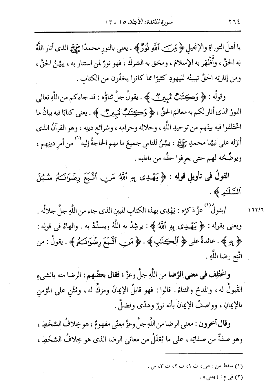 يَا أَهْلَ التَّوْرَاةِ وَالْإِنْجِيلِ مِنَ اللَّهِ نُورٌ , يَعْنِي بِالنُّورِ مُحَمَّدًا صَلَّى اللهُ عَلَيْهِ وَسَلَّمَ , الَّذِي أَنَارَ اللَّهُ بِهِ الْحَقَّ , وَأَظْهَرَ بِهِ الْإِسْلَامَ , وَمَحَقَ بِهِ الشِّرْكَ فَهُوَ نُورٌ لِمَنِ اسْتَنَارَ بِهِ يُبَيِّنُ الْحَقَّ , وَمِنْ إِنَارَتِهِ الْحَقَّ تَبْيِينُهُ لِلْيَهُودِ كَثِيرًا مِمَّا كَانُوا يُخْفُونَ مِنَ الْكِتَابِ. وَقَوْلُهُ: {وَكِتَابٌ مُبِينٌ} [المائدة: 15] يَقُولُ جَلَّ ثَنَاؤُهُ: قَدْ جَاءَكُمْ مِنَ اللَّهِ تَعَالَى النُّورُ الَّذِي أَنَارَ لَكُمْ بِهِ مَعَالِمَ الْحَقِّ. {وَكِتَابٌ مُبِينٌ} [المائدة: 15] يَعْنِي: " كِتَابًا فِيهِ بَيَانُ مَا اخْتَلَفُوا فِيهِ بَيْنَهُمْ مِنْ تَوْحِيدِ اللَّهِ وَحَلَالِهِ وَحَرَامِهِ وَشَرَائِعِ دِينِهِ , وَهُوَ الْقُرْآنُ الَّذِي أَنْزَلَهُ عَلَى نَبِيِّنَا مُحَمَّدٍ صَلَّى اللهُ عَلَيْهِ وَسَلَّمَ , يُبَيِّنُ لِلنَّاسِ جَمِيعَ مَا بِهِمُ الْحَاجَةُ إِلَيْهِ مِنْ أَمْرِ دِينِهِمْ وَيُوَضِّحُهُ لَهُمْ , حَتَّى يَعْرِفُوا حَقَّهُ مِنْ بَاطِلِهِ