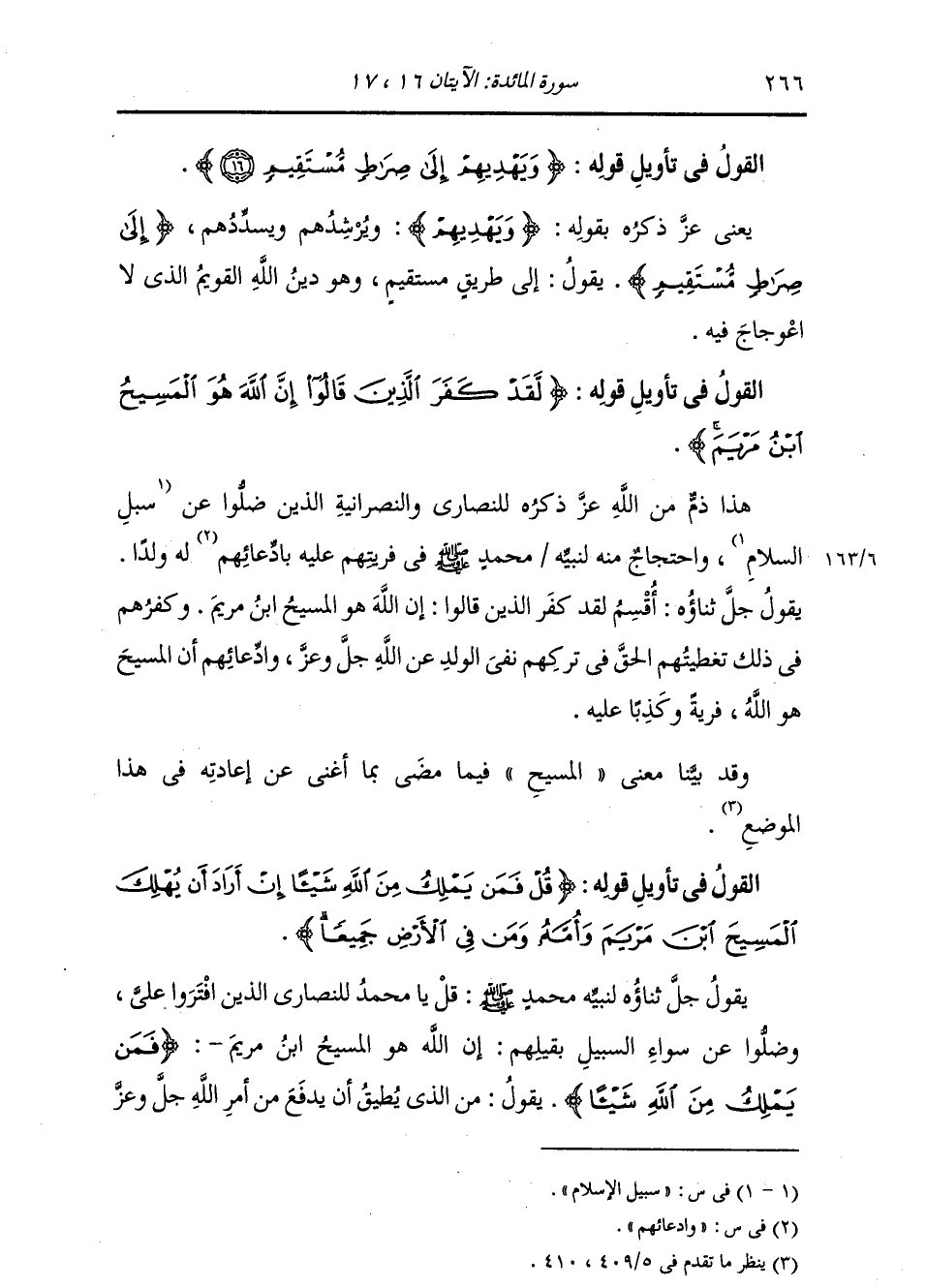 §الْقَوْلُ فِي تَأْوِيلِ قَوْلِهِ تَعَالَى: {لَقَدْ كَفَرَ الَّذِينَ قَالُوا إِنَّ اللَّهَ هُوَ الْمَسِيحُ ابْنُ مَرْيَمَ قُلْ فَمَنْ يَمْلِكُ مِنَ اللَّهِ شَيْئًا إِنْ أَرَادَ أَنْ يُهْلِكَ الْمَسِيحَ ابْنَ مَرْيَمَ وَأُمَّهُ وَمَنْ فِي الْأَرْضِ جَمِيعًا وَلِلَّهِ مُلْكُ السَّمَوَاتِ وَالْأَرْضِ وَمَا بَيْنَهُمَا يَخُلْقُ مَا يَشَاءُ وَاللَّهُ عَلَى كُلِّ شَيْءٍ قَدِيرٌ} هَذَا ذَمٌّ مِنَ اللَّهِ عَزَّ ذِكْرُهُ لِلنَّصَارَى وَالنَّصْرَانِيَّةِ الَّذِينَ ضَلُّوا عَنْ سُبُلِ السَّلَامِ , وَاحْتِجَاجٌ مِنْهُ لِنَبِيِّهِ مُحَمَّدٍ صَلَّى اللهُ عَلَيْهِ وَسَلَّمَ فِي فِرْيَتِهِمْ عَلَيْهِ بِادِّعَائِهِمْ لَهُ وَلَدًا , يَقُولُ جَلَّ ثَنَاؤُهُ: أُقْسِمُ لَقَدْ كَفَرَ الَّذِينَ قَالُوا: إِنَّ اللَّهَ هُوَ الْمَسِيحُ ابْنُ مَرْيَمَ , وَكُفْرُهُمْ فِي ذَلِكَ تَغْطِيَتُهُمُ الْحَقَّ فِي تَرْكِهِمْ نَفْيَ الْوَلَدِ عَنِ اللَّهِ جَلَّ وَعَزَّ , وَادَّعَائِهِمْ أَنَّ الْمَسِيحَ هُوَ اللَّهُ فِرْيَةً وَكَذِبًا عَلَيْهِ وَقَدْ بَيَّنَّا مَعْنَى الْمَسِيحِ فِيمَا مَضَى بِمَا أَغْنَى عَنْ إِعَادَتِهِ فِي هَذَا الْمَوْضِعِ
