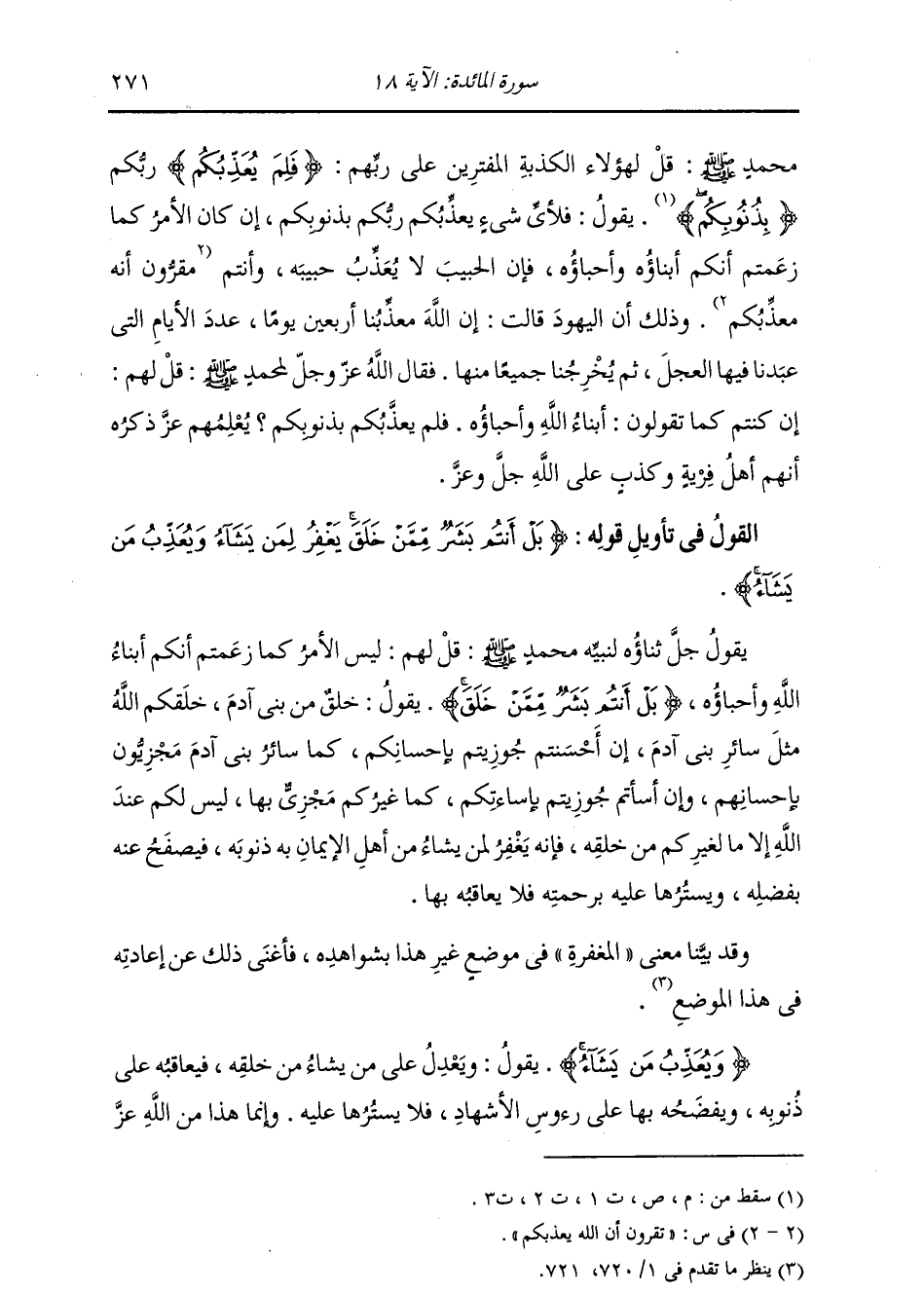 §الْقَوْلُ فِي تَأْوِيلِ قَوْلِهِ تَعَالَى: {بَلْ أَنْتُمْ بَشَرٌ مِمَّنْ خَلَقَ يَغْفِرُ لِمَنْ يَشَاءُ وَيُعَذِّبُ مَنْ يَشَاءُ} [المائدة: 18] يَقُولُ جَلَّ ثَنَاؤُهُ لِنَبِيِّهِ مُحَمَّدٍ صَلَّى اللهُ عَلَيْهِ وَسَلَّمَ: قُلْ لَهُمْ: لَيْسَ الْأَمْرُ كَمَا زَعَمْتُمْ أَنَّكُمْ أَبْنَاءُ اللَّهِ وَأَحِبَّاؤُهُ بَلْ أَنْتُمْ بَشَرٌ مِمَّنْ خَلَقَ , يَقُولُ: خَلْقٌ مِنْ بَنِي آدَمَ , خَلَقَكُمُ اللَّهُ مِثْلَ سَائِرِ بَنِي آدَمَ , إِنْ أَحْسَنْتُمْ جُوزِيتُمْ بِإِحْسَانِكُمْ كَمَا سَائِرُ بَنِي آدَمَ مَجْزِيُّونَ بِإِحْسَانِهِمْ , وَإِنْ أَسَأْتُمْ جُوزِيتُمْ بِإِسَاءَتِكُمْ كَمَا غَيْرُكُمْ مَجْزِيُّ بِهَا , لَيْسَ لَكُمْ عِنْدَ اللَّهِ إِلَّا مَا لَغَيْرِكُمْ مِنْ خَلْقِهِ , فَإِنَّهُ يَغْفِرُ لِمَنْ يَشَاءُ مِنْ أَهْلِ الْإِيمَانِ بِهِ ذُنُوبَهُ , فَيَصْفَحُ عَنْهُ بِفَضْلِهِ , وَيَسْتُرُهَا عَلَيْهِ بِرَحْمَتِهِ , فَلَا يُعَاقِبُهُ بِهَا وَقَدْ بَيَّنَّا مَعْنَى الْمَغْفِرَةِ فِي مَوْضِعٍ غَيْرِ هَذَا بِشَوَاهِدِهِ , فَأَغْنَى ذَلِكَ عَنْ إِعَادَتِهِ فِي هَذَا الْمَوْضِعِ. {وَيُعَذِّبُ مَنْ يَشَاءُ} [البقرة: 284] يَقُولُ: " وَيَعْدِلُ عَلَى مَنْ يَشَاءُ مِنْ خَلْقِهِ , فَيُعَاقِبُهُ عَلَى ذُنُوبِهِ , وَيَفْضَحُهُ بِهَا عَلَى رُءُوسِ الْأَشْهَادِ , فَلَا يَسْتُرُهَا عَلَيْهِ , وَإِنَّمَا هَذَا مِنَ اللَّهِ عَزَّ