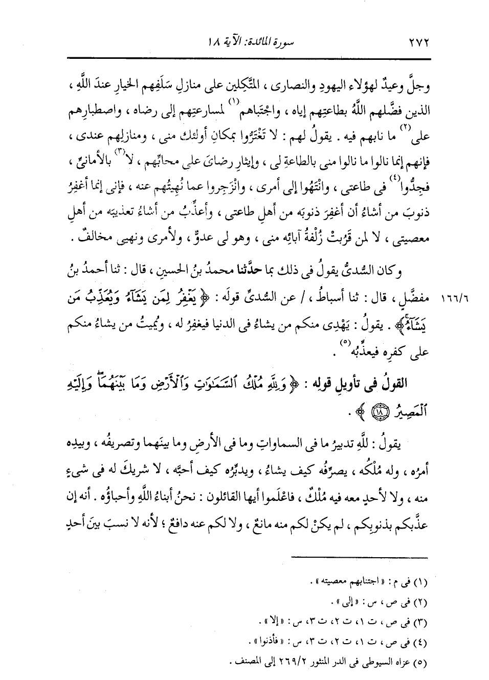 §الْقَوْلُ فِي تَأْوِيلِ قَوْلِهِ تَعَالَى: {وَلِلَّهِ مُلْكُ السَّمَوَاتِ وَالْأَرْضِ وَمَا بَيْنَهُمَا وَإِلَيْهِ الْمَصِيرُ} يَقُولُ: لِلَّهِ تَدْبِيرُ مَا فِي السَّمَوَاتِ وَمَا فِي الْأَرْضِ وَمَا بَيْنَهُمَا , وَتَصْرِيفُهُ , وَبِيَدِهِ أَمْرُهُ , وَلَهُ مُلْكُهُ , يَصْرِفُهُ كَيْفَ يَشَاءُ وَيُدَبِّرُهُ كَيْفَ أَحَبَّهُ , لَا شَرِيكَ لَهُ فِي شَيْءٍ مِنْهُ وَلَا لِأَحَدٍ مَعَهُ فِيهِ مُلْكٌ , فَاعْلَمُوا أَيُّهَا الْقَائِلُونَ: نَحْنُ أَبْنَاءُ اللَّهِ وَأَحِبَّاؤُهُ , أَنَّهُ إِنْ عَذَّبَكُمْ بِذُنُوبِكُمْ , لَمْ يَكُنْ لَكُمْ مِنْهُ مَانِعٌ وَلَا لَكُمْ عَنْهُ دَافِعٌ؛ لِأَنَّهُ لَا نَسَبَ بَيْنَ أَحَدٍ -[273]- وَبَيْنَهُ فَيُحَابِيهِ لِسَبَبِ ذَلِكَ , وَلَا لِأَحَدٍ فِي شَيْءٍ وَمَرْجِعِهِ. فَاتَّقُوا أَيُّهَا الْمُفْتَرُونَ عِقَابَهُ إِيَّاكُمْ عَلَى ذُنُوبِكُمْ بَعْدَ مَرْجِعِكُمْ إِلَيْهِ , وَلَا تَغْتَرُّوا بِالْإِمَانِيِّ وَفَضَائِلِ الْآبَاءِ وَالْإِسْلَافِ