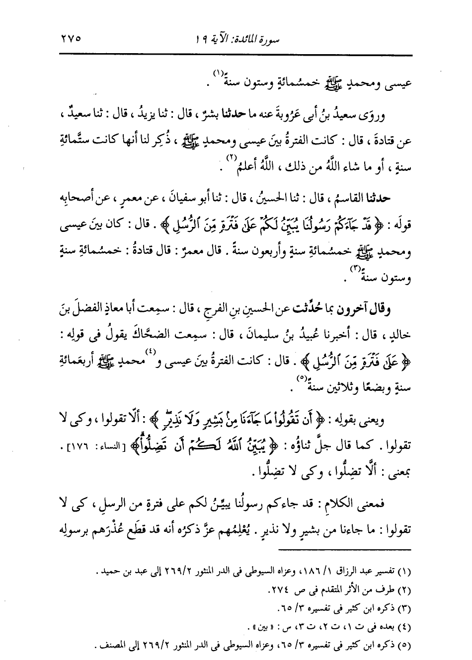 حَدَّثَنَا الْقَاسِمُ , قَالَ: ثنا الْحُسَيْنُ , قَالَ: ثنا أَبُو سُفْيَانَ , عَنْ مَعْمَرٍ , عَنْ أَصْحَابِهِ , قَوْلُهُ: {§قَدْ جَاءَكُمْ رَسُولُنَا يُبَيِّنُ لَكُمْ عَلَى فَتْرَةٍ مِنَ الرُّسُلِ} [المائدة: 19] قَالَ: " كَانَ بَيْنَ عِيسَى وَمُحَمَّدٍ صَلَّى لِلَّهِ عَلَيْهِمَا وَسَلَّمَ خَمْسُمِائَةِ سَنَةٍ وَأَرْبَعُونَ سَنَةً. قَالَ مَعْمَرٌ: قَالَ قَتَادَةُ: خَمْسُمِائَةِ سَنَةٍ وَسِتُّونَ سَنَةً "