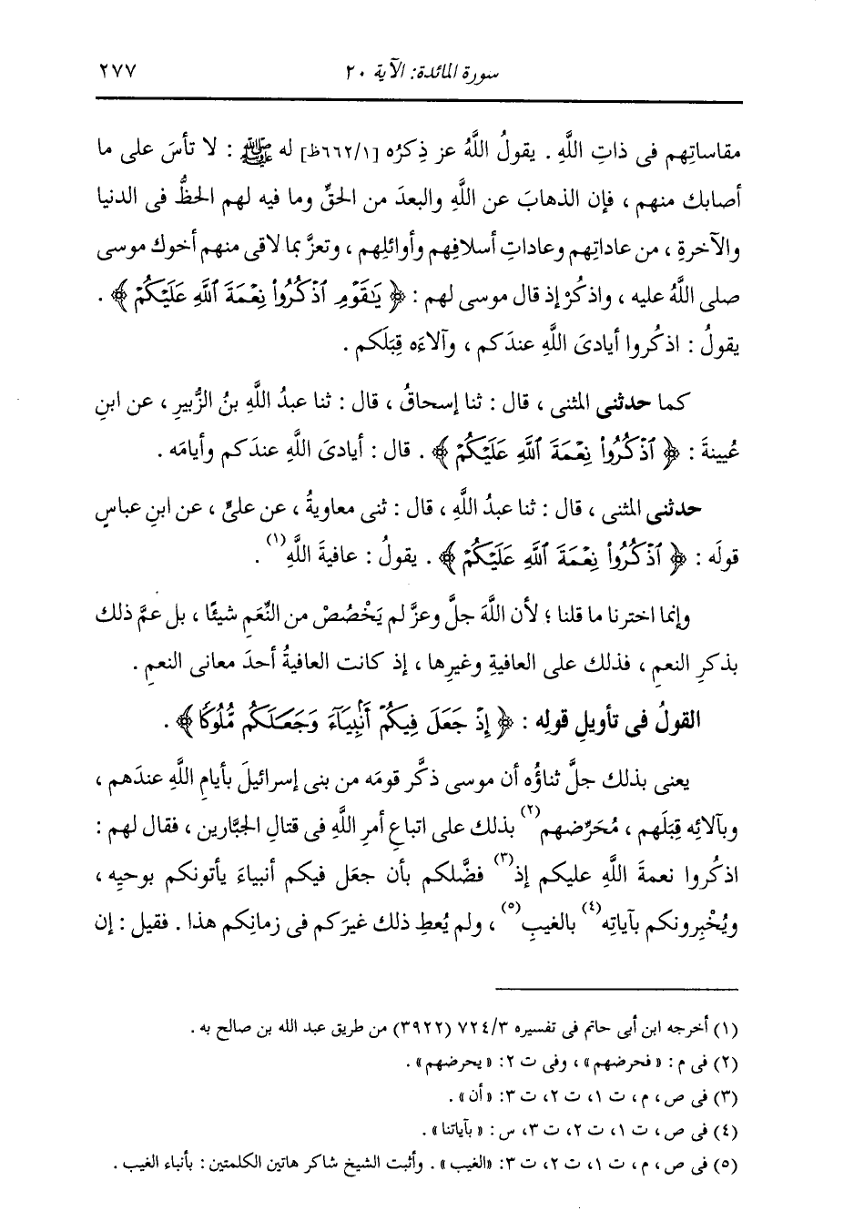 §الْقَوْلُ فِي تَأْوِيلِ قَوْلِهِ تَعَالَى: {إِذْ جَعَلَ فِيكُمْ أَنْبِيَاءَ وَجَعَلَكُمْ مُلُوكًا} [سورة: المائدة، آية رقم: 20] يَعْنِي بِذَلِكَ جَلَّ ثَنَاؤُهُ , أَنَّ مُوسَى ذَكَّرَ قَوْمَهُ مِنْ بَنِي إِسْرَائِيلَ بِأَيَّامِ اللَّهِ عِنْدَهُمْ وَبِآلَائِهِ قِبَلَهُمْ , فَحَرَّضَهُمْ بِذَلِكَ عَلَى اتِّبَاعِ أَمْرِ اللَّهِ فِي قِتَالِ الْجَبَّارِينَ , فَقَالَ لَهُمُ: اذْكُرُوا نِعْمَةَ اللَّهِ عَلَيْكُمْ أَنْ فَضَّلَكُمْ بِأَنْ جَعَلَ فِيكُمْ أَنْبِيَاءَ يَأْتُونَكُمْ بِوَحْيِهِ وَيُخْبِرُونَكُمْ بِآيَاتِهِ الْغَيْبِ , وَلَمْ يُعْطِ ذَلِكَ غَيْرَكُمْ فِي زَمَانِكُمْ هَذَا فَقِيلَ إِنَّ