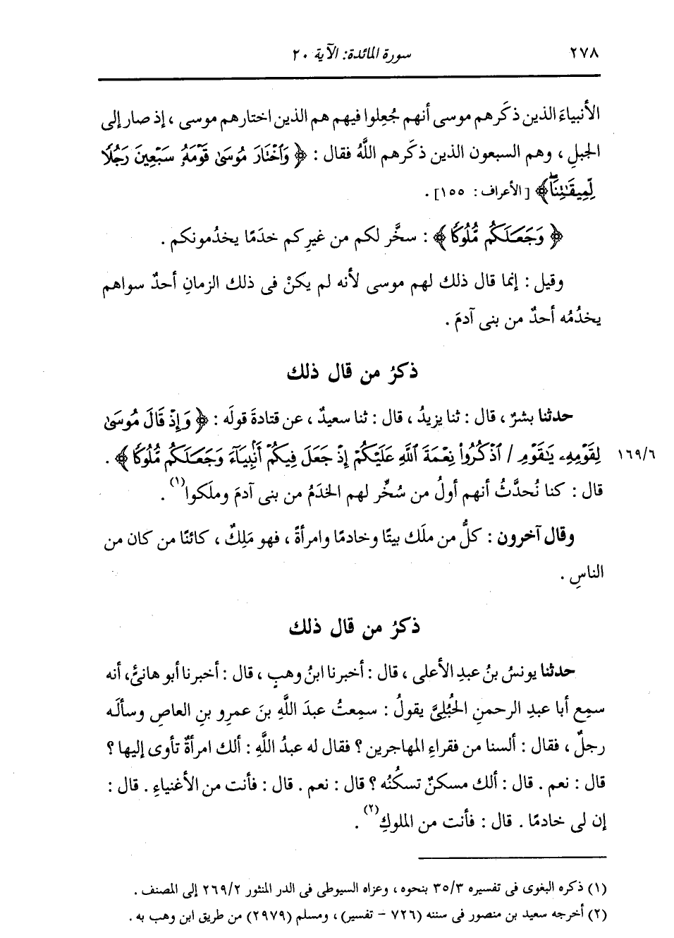 ذِكْرُ مَنْ قَالَ ذَلِكَ: حَدَّثَنَا بِشْرٌ , قَالَ: ثنا يَزِيدُ , قَالَ: ثنا سَعِيدٌ , عَنْ قَتَادَةَ , قَوْلُهُ: {§وَإِذْ قَالَ مُوسَى لِقَوْمِهِ يَا قَوْمِ اذْكُرُوا نِعْمَةَ اللَّهِ عَلَيْكُمْ إِذْ جَعَلَ فِيكُمْ أَنْبِيَاءَ وَجَعَلَكُمْ مُلُوكًا} [المائدة: 20] قَالَ: «كُنَّا نُحَدِّثُ أَنَّهُمْ أَوَّلُ مَنْ سُخِّرَ لَهُمُ الْخَدَمُ مِنْ بَنِي آدَمَ وَمَلَكُوا» وَقَالَ آخَرُونَ: كُلُّ مَنْ مَلَكَ بَيْتًا وَخَادِمًا وَامْرَأَةً , فَهُوَ مَلِكٌ كَائِنًا مَنْ كَانَ مِنَ النَّاسِ