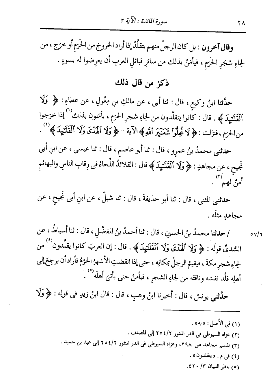 حَدَّثَنَا مُحَمَّدُ بْنُ الْحُسَيْنِ , قَالَ: ثنا أَحْمَدُ بْنُ الْمُفَضَّلِ , قَالَ: ثنا أَسْبَاطٌ , عَنِ السُّدِّيِّ , قَوْلُهُ: {§وَلَا الْهَدْيَ وَلَا الْقَلَائِدَ} [المائدة: 2] قَالَ: «إِنَّ الْعَرَبَ كَانُوا يَتَقَلَّدُونَ مِنْ لِحَاءِ شَجَرِ مَكَّةَ , فَيُقِيمُ الرَّجُلُ بِمَكَانِهِ , حَتَّى إِذَا انْقَضَتِ الْأَشْهُرُ الْحُرُمُ فَأَرَادَ أَنْ يَرْجِعَ إِلَى أَهْلِهِ قَلَّدَ نَفْسَهُ وَنَاقَتَهُ مِنْ لِحَاءِ الشَّجَرِ , فَيَأْمَنُ حَتَّى يَأْتِيَ أَهْلَهُ»