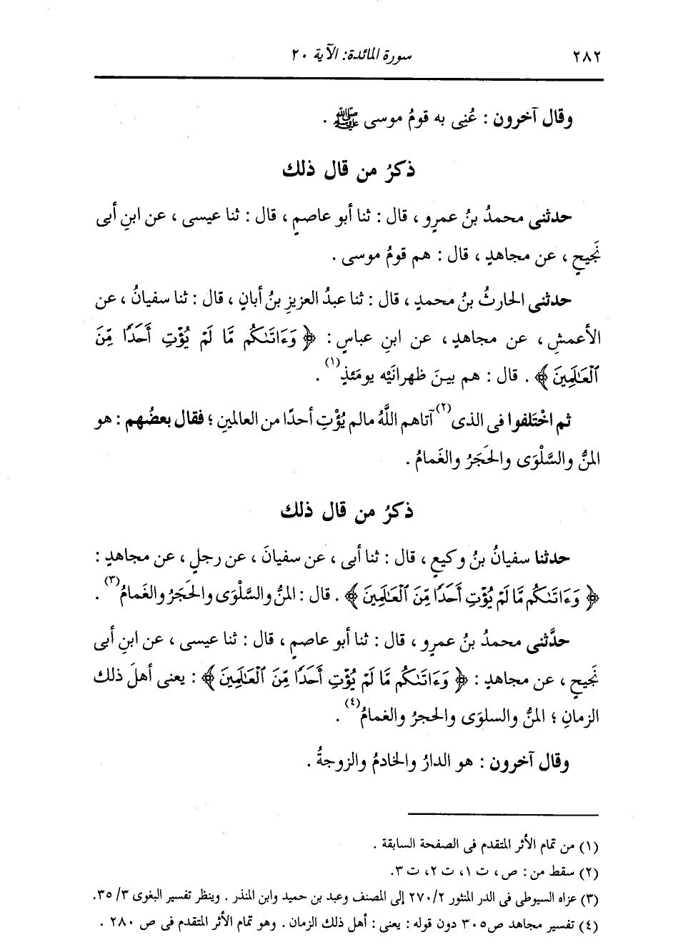 حَدَّثَنِي مُحَمَّدُ بْنُ عَمْرٍو , قَالَ: ثنا أَبُو عَاصِمٍ , قَالَ: ثنا عِيسَى , عَنِ ابْنِ أَبِي نَجِيحٍ , عَنْ مُجَاهِدٍ: {§وَآتَاكُمْ مَا لَمْ يُؤْتِ أَحَدًا مِنَ الْعَالَمِينَ} [المائدة: 20] يَعْنِي أَهْلَ ذَلِكَ الزَّمَانِ , الْمَنَّ وَالسَّلْوَى وَالْحَجَرَ وَالْغَمَامَ " وَقَالَ آخَرُونَ: هُوَ الدَّارُ وَالْخَادِمُ وَالزَّوْجَةُ