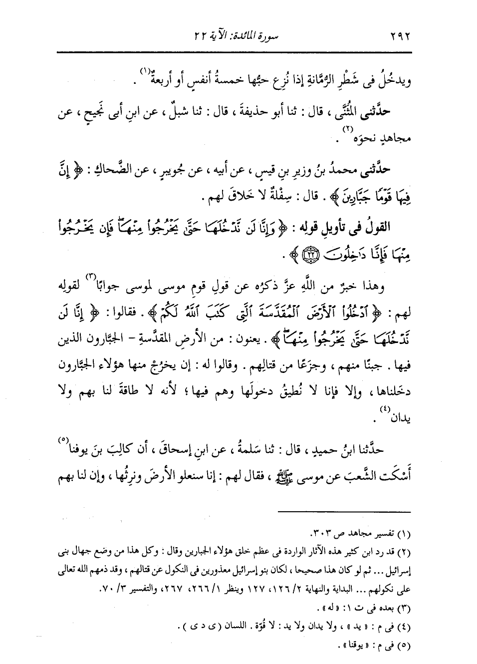§الْقَوْلُ فِي تَأْوِيلِ قَوْلِهِ تَعَالَى: {وَإِنَّا لَنْ نَدْخُلَهَا حَتَّى يَخْرُجُوا مِنْهَا فَإِنْ يَخْرُجُوا مِنْهَا فَإِنَّا دَاخِلُونَ} [المائدة: 22] وَهَذَا خَبَرٌ مِنَ اللَّهِ عَزَّ ذِكْرُهُ عَنْ قَوْلِ قَوْمِ مُوسَى لِمُوسَى جَوَابًا لِقَوْلِهِ لَهُمْ: {ادْخُلُوا الْأَرْضَ الْمُقَدَّسَةَ الَّتِي كَتَبَ اللَّهُ لَكُمْ} [المائدة: 21] فَقَالُوا: {إِنَّا لَنْ نَدْخُلَهَا حَتَّى يَخْرُجُوا مِنْهَا} [المائدة: 22] يَعْنُونَ: مِنَ الْأَرْضِ الْمُقَدَّسَةِ الْجَبَّارُونَ الَّذِينَ فِيهَا , جُبْنًا مِنْهُمْ وَجَزَعًا مِنْ قِتَالِهِمْ. وَقَالُوا لَهُ: إِنْ يَخْرُجْ مِنْهَا هَؤُلَاءِ الْجَبَّارُونَ دَخَلْنَاهَا , وَإِلَّا فَإِنَّا لَا نُطِيقُ دُخُولَهَا وَهُمْ فِيهَا , لِأَنَّهُ لَا طَاقَةَ لَنَا بِهِمْ وَلَا يَدَ