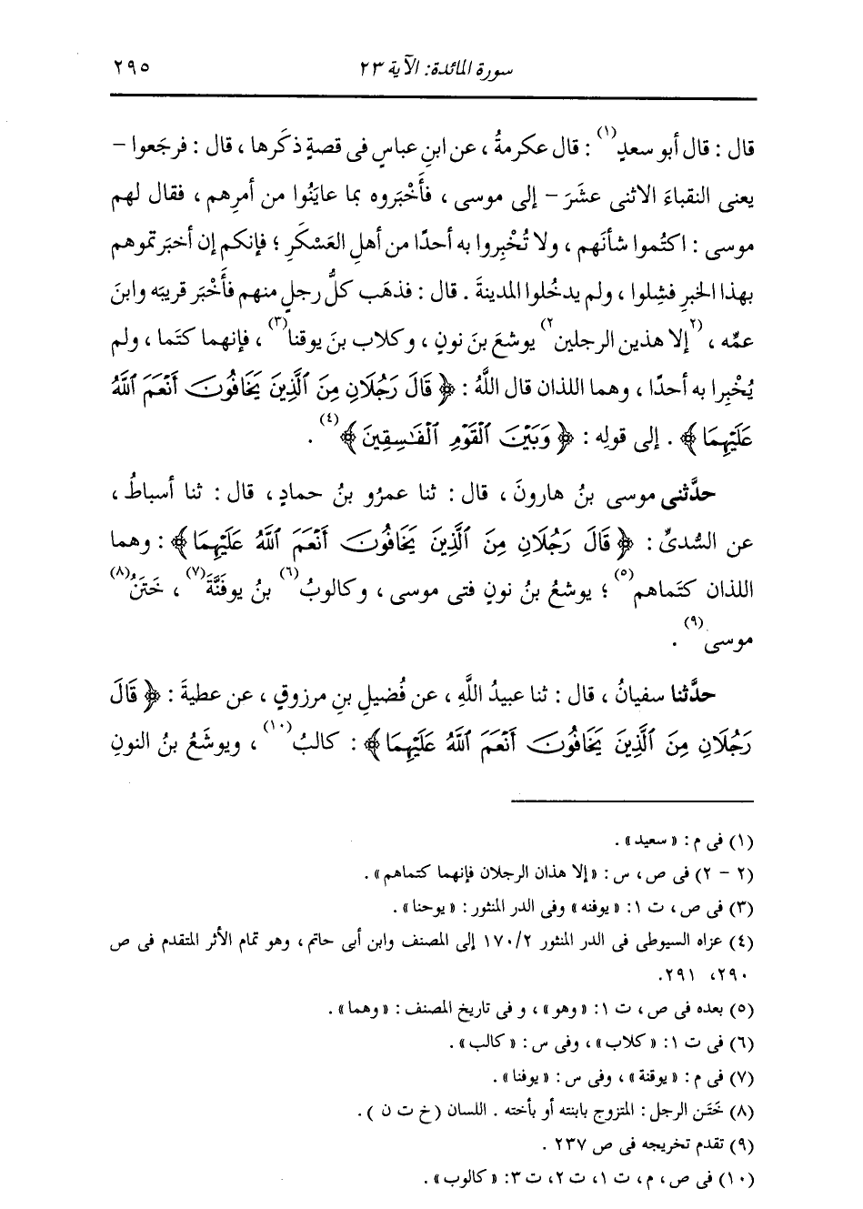 حَدَّثَنِي مُوسَى بْنُ هَارُونَ , قَالَ: ثنا عَمْرُو بْنُ حَمَّادٍ , قَالَ: ثنا أَسْبَاطٌ , عَنِ السُّدِّيِّ: {§قَالَ رَجُلَانِ مِنَ الَّذِينَ يَخَافُونَ أَنْعَمَ اللَّهُ عَلَيْهِمَا} [المائدة: 23] وَهُمَا اللَّذَانِ كَتَمَاهُمْ: يُوشَعُ بْنُ نُونٍ فَتَى مُوسَى , وَكَالُوبُ بْنُ يوفنة خَتَنُ مُوسَى "
