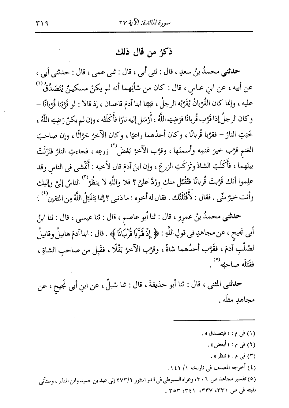 حَدَّثَنِي مُحَمَّدُ بْنُ عَمْرٍو , قَالَ: ثنا أَبُو عَاصِمٍ , قَالَ: ثنا عِيسَى , قَالَ: ثنا ابْنُ أَبِي نَجِيحٍ , عَنْ مُجَاهِدٍ , فِي قَوْلِ اللَّهِ: {§إِذْ قَرَّبَا قُرْبَانًا} [المائدة: 27] قَالَ: «ابْنَا آدَمَ هَابِيلُ وَقَابِيلُ لِصُلْبِ آدَمَ , فَقَرَّبَ أَحَدُهُمَا شَاةً وَقَرَّبَ الْآخَرُ بَقْلًا , فَقَبِلَ مِنْ صَاحِبِ الشَّاةِ , فَقَتَلَهُ صَاحِبُهُ» حَدَّثَنِي الْمُثَنَّى , قَالَ: ثنا أَبُو حُذَيْفَةَ , قَالَ: ثنا شِبْلٌ , عَنِ ابْنِ أَبِي نَجِيحٍ , عَنْ مُجَاهِدٍ , مِثْلَهُ
