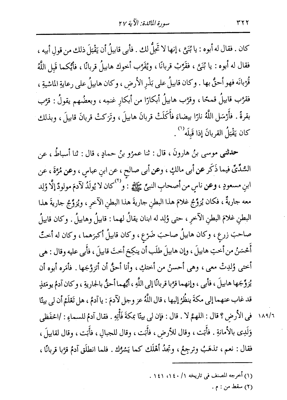 حَدَّثَنِي مُوسَى بْنُ هَارُونَ , قَالَ: ثنا عَمْرُو بْنُ حَمَّادٍ , قَالَ: ثنا أَسْبَاطٌ , عَنِ السُّدِّيِّ , فِيمَا ذَكَرَ عَنْ أَبِي مَالِكٍ , وَعَنْ أَبِي صَالِحٍ , عَنِ ابْنِ عَبَّاسٍ , وَعَنْ مُرَّةَ , عَنِ ابْنِ مَسْعُودٍ , وَعَنْ نَاسٍ , مِنْ أَصْحَابِ النَّبِيِّ صَلَّى اللهُ عَلَيْهِ وَسَلَّمَ: كَانَ لَا يُولَدُ لِآدَمَ مَوْلُودٌ إِلَّا وُلِدَ مَعَهُ جَارِيَةٌ , فَكَانَ يُزَوِّجُ غُلَامَ هَذَا الْبَطْنِ جَارِيَةَ هَذَا الْبَطْنِ الْآخَرِ , وَيُزَوِّجُ جَارِيَةَ هَذَا الْبَطْنِ غُلَامَ الْبَطْنِ هَذَا الْآخَرِ. حَتَّى وُلِدَ لَهُ ابْنَانِ يُقَالَ لَهُمَا: " §قَابِيلُ , وَهَابِيلُ , وَكَانَ قَابِيلُ صَاحِبَ زَرْعٍ , وَكَانَ هَابِيلُ صَاحِبَ ضَرْعٍ. وَكَانَ قَابِيلُ أَكْبَرَهُمَا , وَكَانَ لَهُ أُخْتٌ أَحْسَنَ مِنْ أُخْتِ هَابِيلَ. وَإِنَّ هَابِيلَ طَلَبَ أَنْ يَنْكِحَ أُخْتَ قَابِيلَ , فَأَبَى عَلَيْهِ وَقَالَ: هِيَ أُخْتِي وُلِدَتْ مَعِي , وَهِيَ أَحْسَنُ مِنْ أُخْتِكَ , وَأَنَا أَحَقُّ أَنْ أَتَزَوَّجَهَا. فَأَمَرَهُ أَبُوهُ أَنْ يُزَوِّجَهَا هَابِيلَ فَأَبَى. وَإِنَّهُمَا قَرَّبَا قُرْبَانًا إِلَى اللَّهِ أَيُّهُمَا أَحَقُّ بِالْجَارِيَةِ , وَكَانَ آدَمُ يَوْمَئِذٍ قَدْ غَابَ عَنْهُمَا إِلَى مَكَّةَ يَنْظُرُ إِلَيْهَا , قَالَ اللَّهُ لِآدَمَ: يَا آدَمُ , هَلْ تَعْلَمُ أَنَّ لِيَ بَيْتًا فِي الْأَرْضَ؟ قَالَ: اللَّهُمَّ لَا. قَالَ: فَإِنَّ لِي بَيْتًا بِمَكَّةَ فَأْتِهِ. فَقَالَ آدَمُ لِلسَّمَاءِ: احْفَظِي وَلَدِي بِالْإِمَانَةِ , فَأَبَتْ. وَقَالَ لِلْأَرْضِ فَأَبَتْ , وَقَالَ لِلْجِبَالِ فَأَبَتْ , وَقَالَ لقَابِيلَ , فَقَالَ: نَعَمْ تَذْهَبُ وَتَرْجِعُ وَتَجِدُ أَهْلَكَ كَمَا يَسُرُّكَ. فَلَمَّا انْطَلَقَ آدَمُ قَرَّبَا قُرْبَانًا , -[323]- وَكَانَ قَابِيلُ يَفْخَرُ عَلَيْهِ , فَقَالَ: أَنَا أَحَقُّ بِهَا مِنْكَ , هِيَ أُخْتِي , وَأَنَا أَكْبَرُ مِنْكَ , وَأَنَا وَصِيُّ وَالِدِي. فَلَمَّا قَرَّبَا , قَرَّبَ هَابِيلُ جَذَعَةً سَمِينَةً , وَقَرَّبَ قَابِيلُ حُزْمَةَ سُنْبِلٍ , فَوَجَدَ فِيهَا سُنْبُلَةً عَظِيمَةً فَفَرَكَهَا فَأَكَلَهَا. فَنَزَلَتِ النَّارُ فَأَكَلَتْ قُرْبَانَ هَابِيلَ , وَتَرَكَتْ قُرْبَانَ قَابِيلَ , فَغَضِبَ وَقَالَ: لَأَقْتُلَنَّكَ حَتَّى لَا تَنْكِحَ أُخْتِي. فَقَالَ هَابِيلُ {إِنَّمَا يَتَقَبَّلُ اللَّهُ مِنَ الْمُتَّقِينَ} [المائدة: 27] "