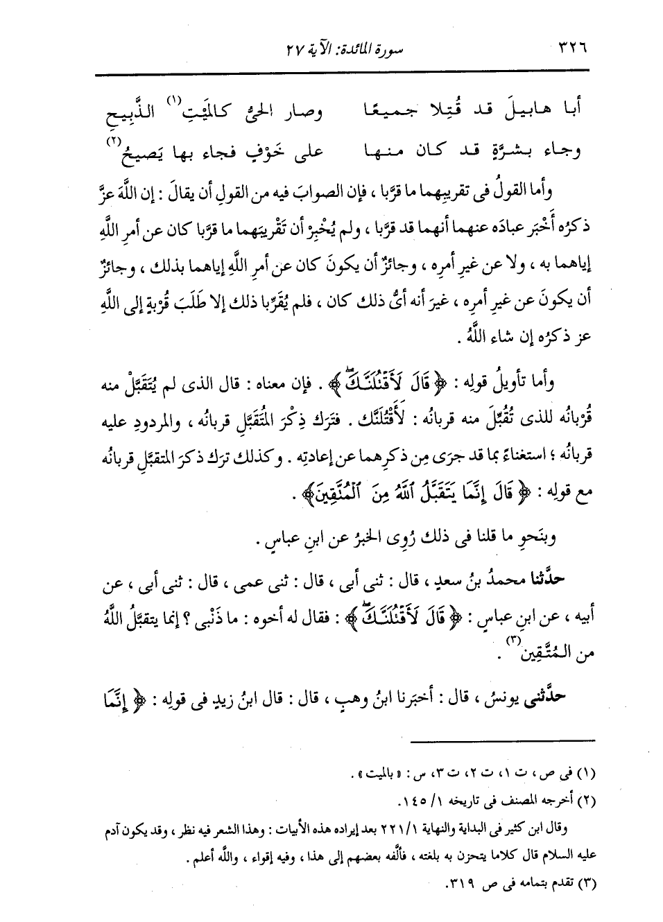حَدَّثَنَا مُحَمَّدُ بْنُ سَعْدٍ , قَالَ: ثني أَبِي , قَالَ: ثني عَمِّي , قَالَ: ثني أَبِي , عَنْ أَبِيهِ , عَنِ ابْنِ عَبَّاسٍ: {§قَالَ لَأَقْتُلَنَّكَ} [المائدة: 27] فَقَالَ لَهُ أَخُوهُ: مَا ذَنْبِي {إِنَّمَا يَتَقَبَّلُ اللَّهُ مِنَ الْمُتَّقِينَ} [المائدة: 27] "