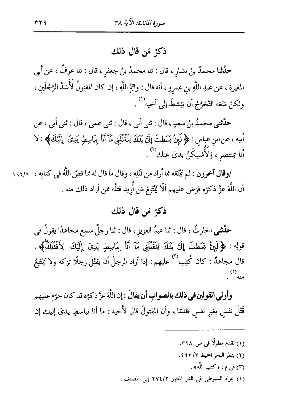 حَدَّثَنِي مُحَمَّدُ بْنُ سَعْدٍ , قَالَ: ثني أَبِي , قَالَ: ثني عَمِّي , قَالَ: ثني أَبِي , عَنْ أَبِيهِ , عَنِ ابْنِ عَبَّاسٍ: {§لَئِنْ بَسَطْتَ إِلَيَّ يَدَكَ لِتَقْتُلَنِي مَا أَنَا بِبَاسِطٍ يَدِيَ إِلَيْكَ} [المائدة: 28] لَا أَنَا بِمُنْتَصِرٍ , وَلَأَمْسِكَنَّ يَدِي عَنْكَ " وَقَالَ آخَرُونَ: لَمْ يَمْنَعْهُ مِمَّا أَرَادَ مِنْ قَتْلِهِ , وَقَالَ مَا قَالَ لَهُ مِمَّا قَصَّ اللَّهُ فِي كِتَابِهِ. إِلَّا أَنَّ اللَّهَ عَزَّ ذِكْرُهُ فَرَضَ عَلَيْهِمْ أَنْ لَا يَمْتَنِعَ مَنْ أُرِيدَ قَتْلُهُ مِمَّنْ أَرَادَ ذَلِكَ مِنْهُ