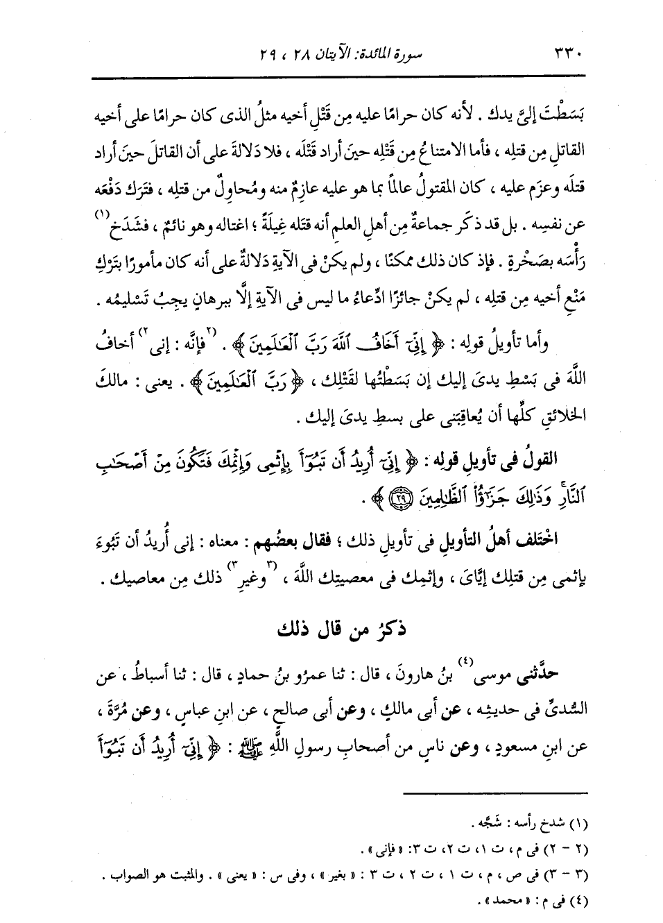 ذِكْرُ مَنْ قَالَ ذَلِكَ: حَدَّثَنِي مُوسَى بْنُ هَارُونَ , قَالَ: ثنا عَمْرُو بْنُ حَمَّادٍ , قَالَ: ثنا أَسْبَاطٌ , عَنِ السُّدِّيِّ , فِي حَدِيثِهِ عَنْ أَبِي مَالِكٍ , وَعَنْ أَبِي صَالِحٍ , عَنِ ابْنِ عَبَّاسٍ , وَعَنْ مُرَّةَ , عَنِ ابْنِ مَسْعُودٍ , وَعَنْ نَاسٍ , مِنْ أَصْحَابِ رَسُولِ اللَّهِ صَلَّى اللهُ عَلَيْهِ وَسَلَّمَ: {§إِنِّي أُرِيدُ أَنْ تَبُوءَ -[331]- بِإِثْمِي وَإِثْمِكَ} [المائدة: 29] يَقُولُ: " إِثْمَ قَتْلِي إِلَى إِثْمِكَ الَّذِي فِي عُنُقِكَ {فَتَكُونَ مِنْ أَصْحَابِ النَّارِ} [المائدة: 29]