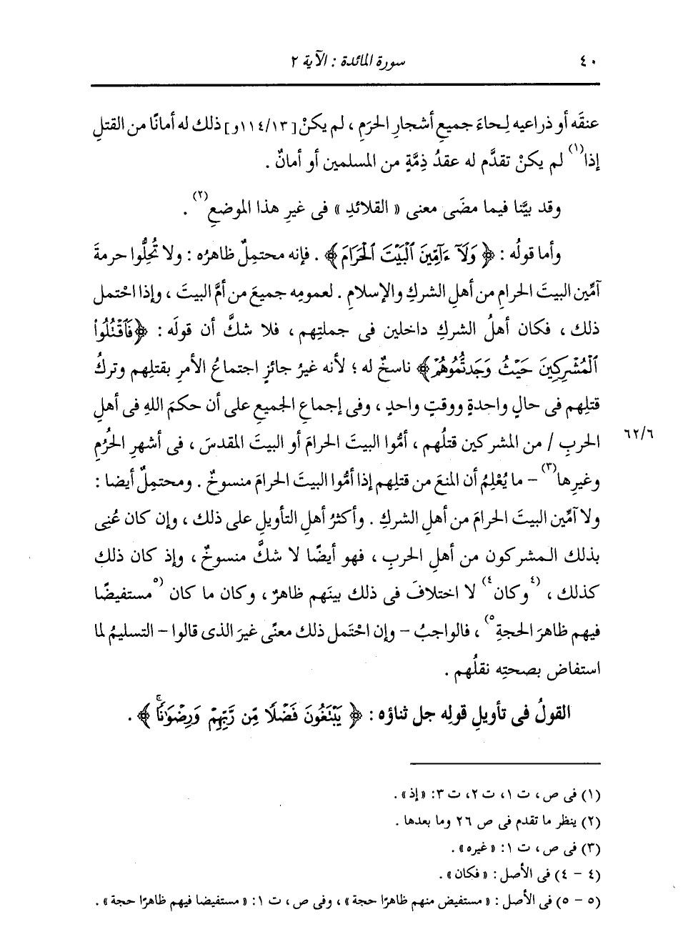 §الْقَوْلُ فِي تَأْوِيلِ قَوْلِهِ تَعَالَى: {يَبْتَغُونَ فَضْلًا مِنْ رَبِّهِمْ وَرِضْوَانًا} [المائدة: 2]-[41]- يَعْنِي بِقَوْلِهِ: {يَبْتَغُونَ} [المائدة: 2] يَطْلُبُونَ وَيَلْتَمِسُونَ. وَالْفَضْلُ: الْأَرْبَاحُ فِي التِّجَارَةِ؛ وَالرِّضْوَانُ: رِضَا اللَّهِ عَنْهُمْ , فَلَا يُحِلُّ بِهِمْ مِنَ الْعُقُوبَةِ فِي الدُّنْيَا مَا أَحَلَّ بِغَيْرِهِمْ مِنَ الْأُمَمِ فِي عَاجِلِ دُنْيَاهُمْ بِحَجِّهِمْ بَيْتَهُ " وَبِنَحْوِ الَّذِي قُلْنَا فِي ذَلِكَ قَالَ أَهْلُ التَّأْوِيلِ