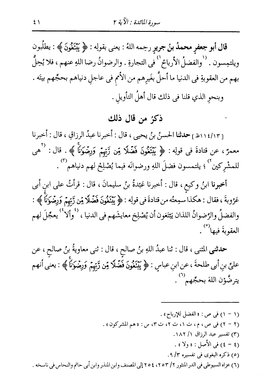 ذِكْرُ مَنْ قَالَ ذَلِكَ: حَدَّثَنَا الْحَسَنُ بْنُ يَحْيَى , قَالَ: أَخْبَرَنَا عَبْدُ الرَّزَّاقِ , قَالَ: ثنا مَعْمَرٌ , عَنْ قَتَادَةَ , فِي قَوْلِهِ: {§يَبْتَغُونَ فَضْلًا مِنْ رَبِّهِمْ وَرِضْوَانًا} [المائدة: 2] قَالَ: «هُمُ الْمُشْرِكُونَ يَلْتَمِسُونَ فَضْلَ اللَّهِ وَرِضْوَانَهُ فِيمَا يُصْلِحُ لَهُمْ دُنْيَاهُمْ»