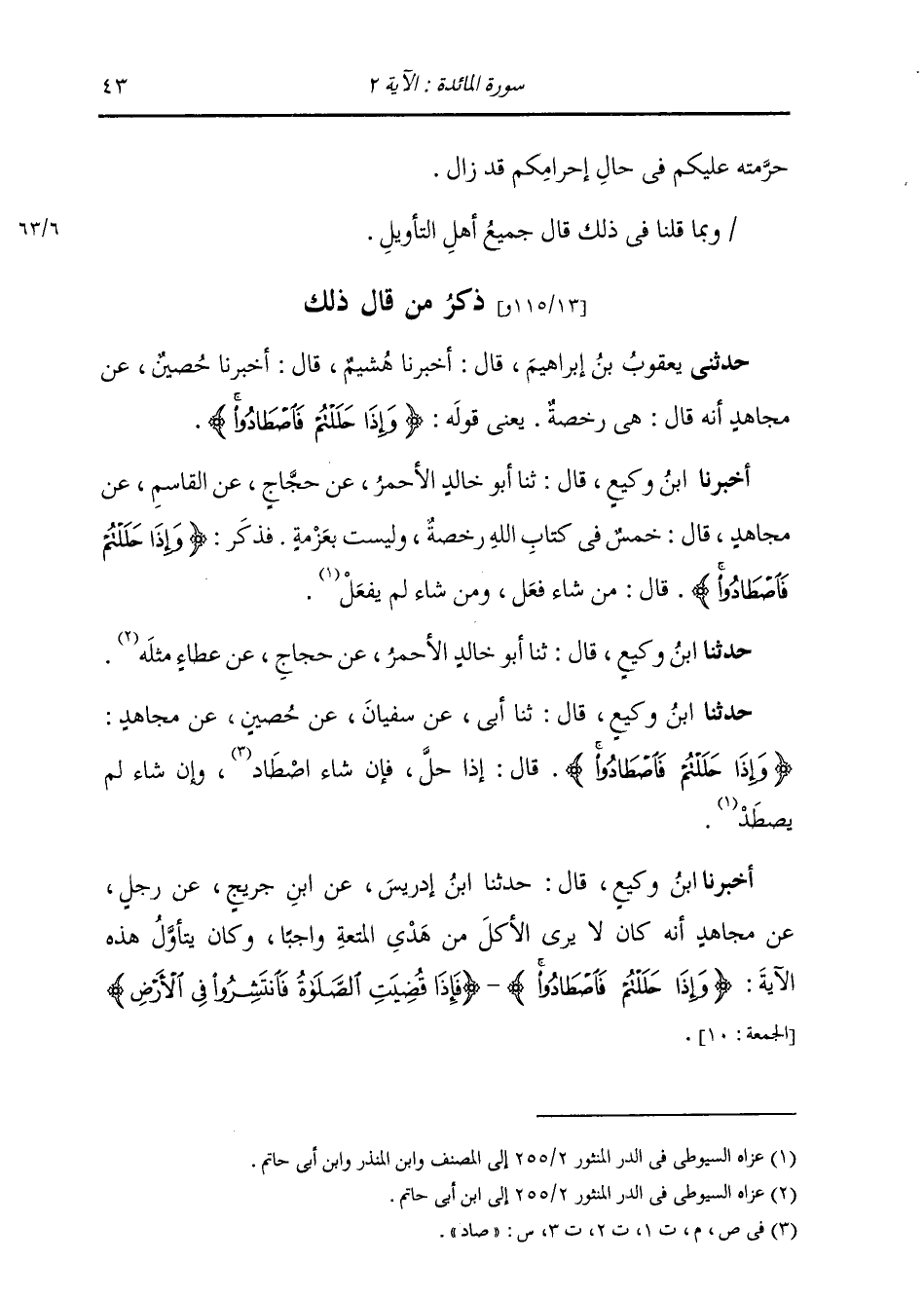 حَدَّثَنَا ابْنُ وَكِيعٍ , قَالَ: ثنا أَبِي , عَنْ سُفْيَانَ , عَنْ حُصَيْنٍ , عَنْ مُجَاهِدٍ: {§وَإِذَا حَلَلْتُمْ فَاصْطَادُوا} [المائدة: 2] قَالَ: «إِذَا حَلَّ , فَإِنْ شَاءَ صَادَ , وَإِنْ شَاءَ لَمْ يَصْطَدْ»