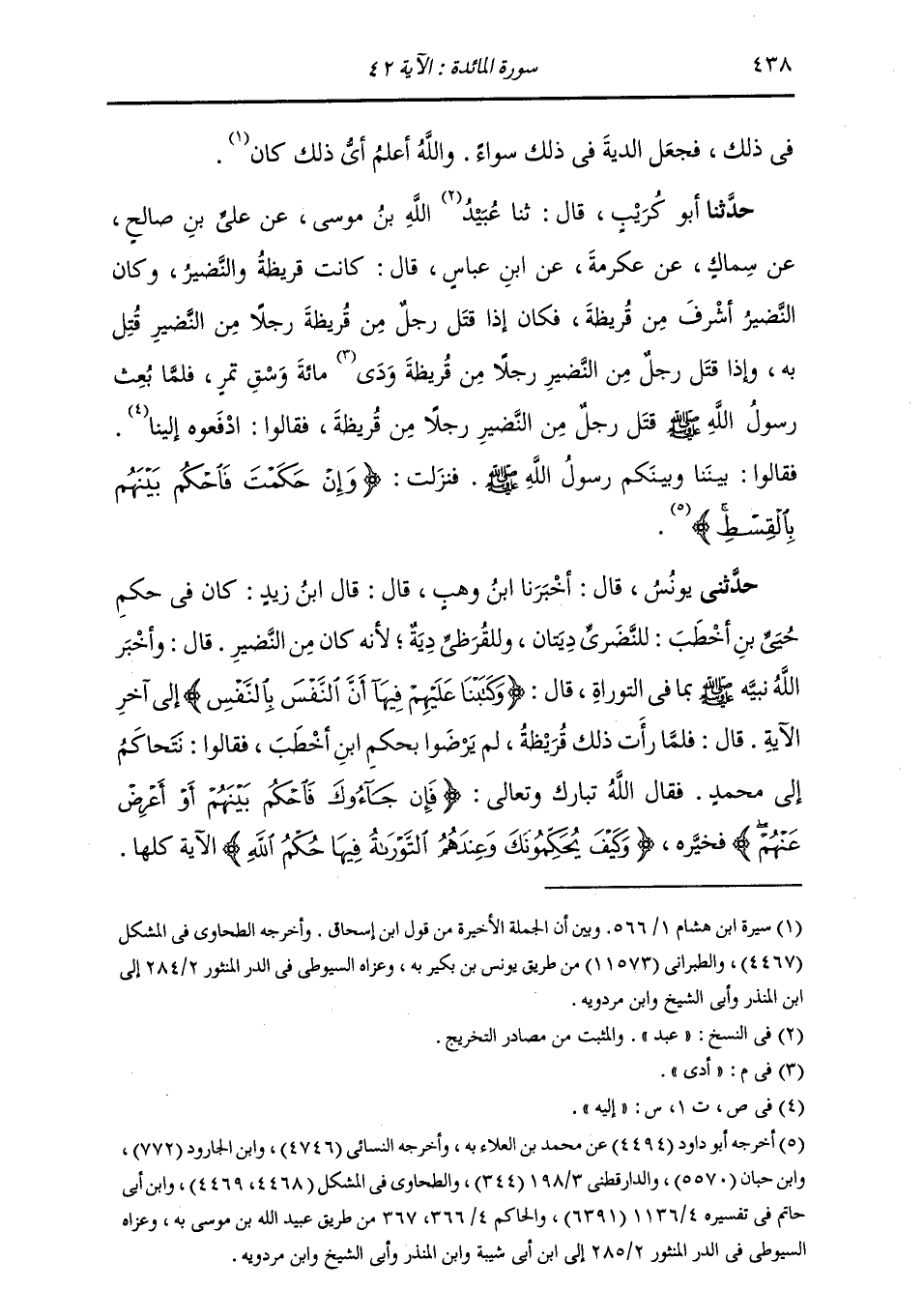 حَدَّثَنَا أَبُو كُرَيْبٍ , قَالَ: ثنا عُبَيْدُ اللَّهِ بْنُ مُوسَى , عَنْ عَلِيِّ بْنِ صَالِحٍ , عَنْ سِمَاكٍ , عَنْ عِكْرِمَةَ , عَنِ ابْنِ عَبَّاسٍ , قَالَ: كَانَتْ قُرَيْظَةُ وَالنَّضِيرُ , وَكَانَ النَّضِيرُ أَشْرَفَ مِنْ قُرَيْظَةَ , فَكَانَ إِذَا قَتَلَ رَجُلٌ مِنْ قُرَيْظَةَ رَجُلًا مِنَ النَّضِيرِ قُتِلَ بِهِ , وَإِذَا قَتَلَ رَجُلٌ مِنَ النَّضِيرِ رَجُلًا مِنْ قُرَيْظَةَ أَدَّى مِئَةَ وَسَقٍ تَمْرٍ. فَلَمَّا بُعِثَ رَسُولُ اللَّهِ صَلَّى اللهُ عَلَيْهِ وَسَلَّمَ قَتَلَ رَجُلٌ مِنَ النَّضِيرِ رَجُلًا مِنْ قُرَيْظَةَ , فَقَالُوا: ادْفَعُوهُ إِلَيْنَا. فَقَالُوا: بَيْنَنَا وَبَيْنَكُمْ رَسُولُ اللَّهِ صَلَّى اللهُ عَلَيْهِ وَسَلَّمَ. فَنَزَلَتْ: {§وَإِنْ حَكَمْتَ فَاحْكُمْ بَيْنَهُمْ بِالْقِسْطِ} [المائدة: 42] "