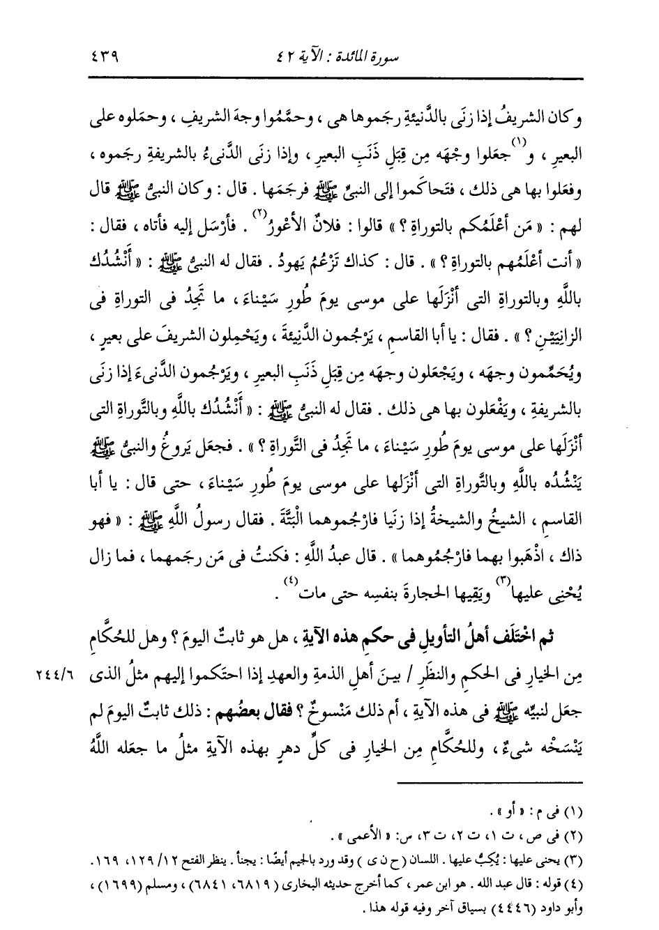 وَكَانَ الشَّرِيفُ إِذَا زَنَى بِالدَّنِيئَةِ رَجَمُوهَا هِيَ وَحَمَّمُوا وَجْهَ الشَّرِيفِ , وَحَمَلُوهُ عَلَى الْبَعِيرِ , أَوْ جَعَلُوا وَجْهَهُ مِنْ قِبَلِ ذَنَبِ الْبَعِيرِ. وَإِذَا زَنَى الدَّنِيءُ بِالشَّرِيفَةِ رَجَمُوهُ , وَفَعَلُوا بِهَا ذَلِكَ. فتَحَاكَمُوا إِلَى النَّبِيِّ صَلَّى اللهُ عَلَيْهِ وَسَلَّمَ , فَرَجَمَهَا. قَالَ: وَكَانَ النَّبِيُّ صَلَّى اللهُ عَلَيْهِ وَسَلَّمَ قَالَ لَهُمْ: «مَنْ أَعْلَمُكُمْ بِالتَّوْرَاةِ؟» قَالُوا: فُلَانٌ الْأَعْوَرُ. فَأَرْسَلَ إِلَيْهِ , فَأَتَاهُ , فَقَالَ: «أَنْتَ أَعْلَمُهُمْ بِالتَّوْرَاةِ؟» قَالَ: كَذَاكَ تَزْعُمُ يَهُودُ , فَقَالَ لَهُ النَّبِيُّ صَلَّى اللهُ عَلَيْهِ وَسَلَّمَ: «أَنْشُدُكَ بِاللَّهِ وَبِالتَّوْرَاةِ الَّتِي أَنْزَلَهَا عَلَى مُوسَى يَوْمَ طُورِ سَيْنَاءَ مَا تَجِدُ فِي التَّوْرَاةِ فِي الزَّانِيَيْنِ؟» فَقَالَ: يَا أَبَا الْقَاسِمِ , يَرْجُمُونَ الدَّنِيئَةَ , وَيَحْمِلُونَ الشَّرِيفَ عَلَى بَعِيرٍ , وَيُحَمِّمُونَ وَجْهَهُ , وَيَجْعَلُونَ وَجْهَهُ مِنْ قِبَلِ ذَنَبِ الْبَعِيرِ , وَيَرْجُمُونَ الدَّنِيءَ إِذَا زَنَى بِالشَّرِيفَةِ , وَيَفْعَلُونَ بِهَا هِيَ ذَلِكَ. فَقَالَ لَهُ النَّبِيُّ صَلَّى اللهُ عَلَيْهِ وَسَلَّمَ: «أَنْشُدُكَ بِاللَّهِ وَبِالتَّوْرَاةِ الَّتِي أَنْزَلَهَا عَلَى مُوسَى يَوْمَ طُورِ سَيْنَاءَ مَا تَجِدُ فِي التَّوْرَاةِ؟» فَجَعَلَ يَرُوغُ وَالنَّبِيُّ صَلَّى اللهُ عَلَيْهِ وَسَلَّمَ يَنْشُدُهُ بِاللَّهِ وَبِالتَّوْرَاةِ الَّتِي أَنْزَلَهَا عَلَى مُوسَى يَوْمَ طُورِ سَيْنَاءَ , حَتَّى قَالَ: يَا أَبَا الْقَاسِمِ الشَّيْخُ وَالشَّيْخَةُ إِذَا زَنَيَا فَارْجُمُوهُمَا الْبَتَّةَ. فَقَالَ رَسُولُ اللَّهِ صَلَّى اللهُ عَلَيْهِ وَسَلَّمَ: «فَهُوَ ذَاكَ , اذْهَبُوا بِهِمَا فَارْجُمُوهُمَا» قَالَ عَبْدُ اللَّهِ: فَكُنْتُ فِيمَنْ رَجَمَهُمَا , فَمَا زَالَ يُجْنِئُ عَلَيْهَا وَيَقِيهَا الْحِجَارَةَ بِنَفْسِهِ حَتَّى مَاتَ , ثُمَّ اخْتَلَفَ أَهْلُ التَّأْوِيلِ فِي حُكْمِ هَذِهِ الْآيَةِ هَلْ هُوَ ثَابِتٌ الْيَوْمَ وَهَلْ لِلْحُكَّامِ مِنَ الْخِيَارِ فِي الْحُكْمِ وَالنَّظَرِ بَيْنَ أَهْلِ الذِّمَّةِ وَالْعَهْدِ إِذَا احْتَكَمُوا إِلَيْهِمْ , مِثْلُ الَّذِي جَعَلَ لِنَبِيِّهِ صَلَّى اللهُ عَلَيْهِ وَسَلَّمَ فِي هَذِهِ الْآيَةِ , أَمْ ذَلِكَ مَنْسُوخٌ؟ فَقَالَ بَعْضُهُمْ: ذَلِكَ ثَابِتٌ الْيَوْمَ لَمْ يَنْسَخْهُ شَيْءٌ , وَلِلْحُكَّامِ مِنَ الْخِيَارِ فِي كُلِّ دَهْرٍ بِهَذِهِ الْآيَةِ مِثْلُ مَا جَعَلَهُ