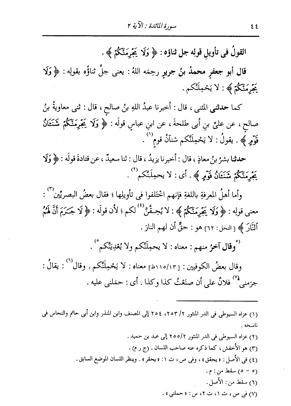 حَدَّثَنِي الْمُثَنَّى , قَالَ: ثنا عَبْدُ اللَّهِ بْنُ صَالِحٍ , قَالَ: ثني مُعَاوِيَةُ بْنُ صَالِحٍ , عَنْ عَلِيٍّ , عَنِ ابْنِ عَبَّاسٍ , قَوْلُهُ: {§وَلَا يَجْرِمَنَّكُمْ شَنَآنُ قَوْمٍ} [المائدة: 2] يَقُولُ: «لَا يَحْمِلَنَّكُمْ شَنَآنُ قَوْمٍ»