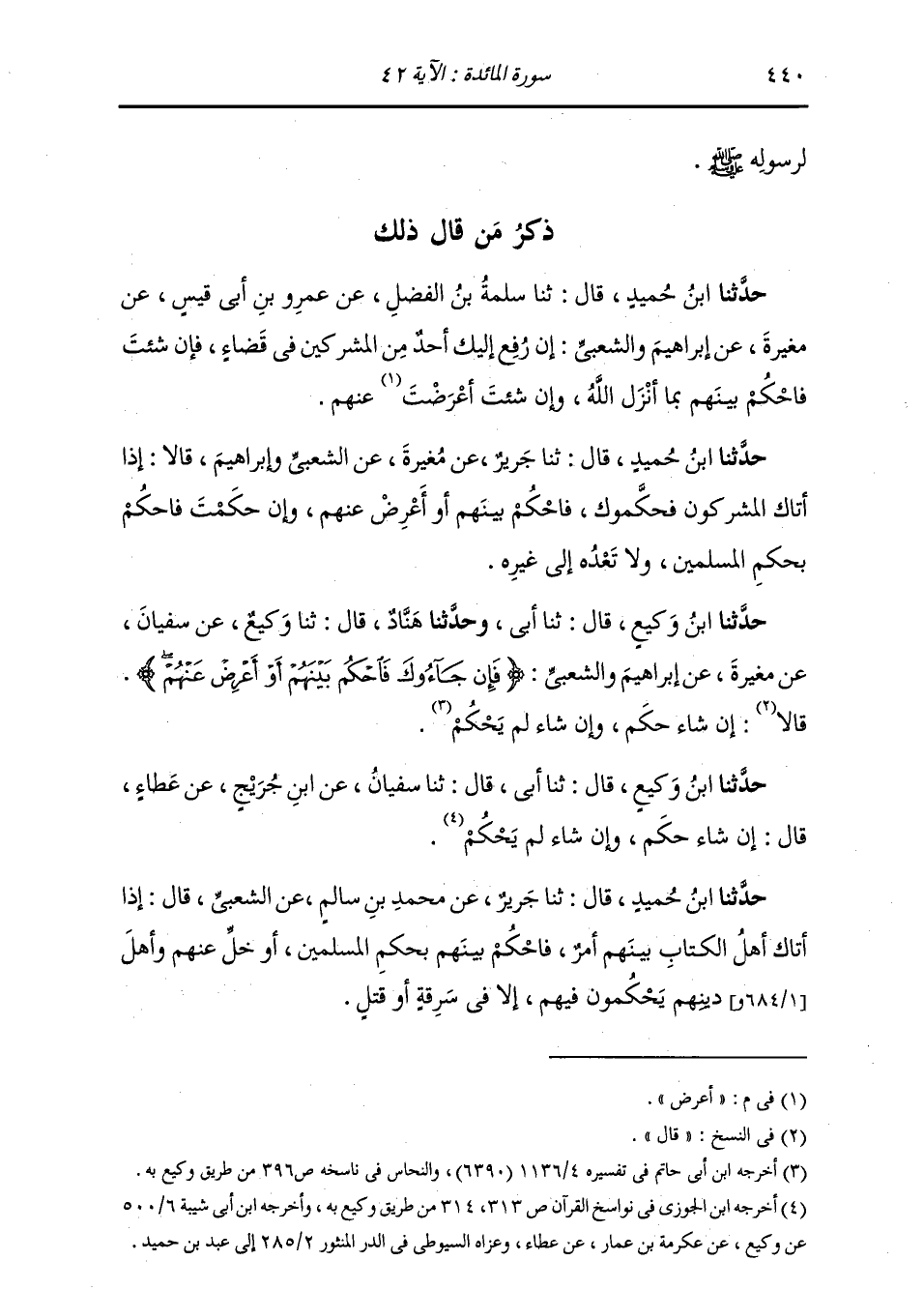 حَدَّثَنَا ابْنُ وَكِيعٍ , قَالَ: ثنا أَبِي , وَحَدَّثَنَا هَنَّادٌ , قَالَ: ثنا وَكِيعٌ , عَنْ سُفْيَانَ , عَنْ مُغِيرَةَ , عَنْ إِبْرَاهِيمَ وَالشَّعْبِيِّ: {§فَإِنْ جَاءُوكَ فَاحْكُمْ بَيْنَهُمْ أَوْ أَعْرِضْ عَنْهُمْ} قَالَ: «إِنْ شَاءَ حَكَمَ , وَإِنْ شَاءَ لَمْ يَحْكُمْ»