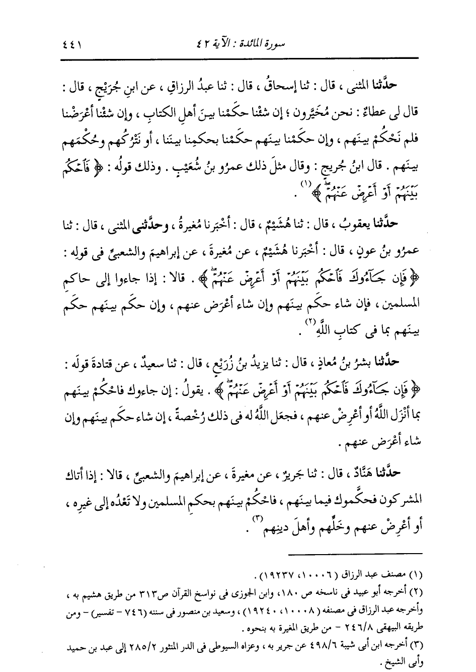 حَدَّثَنَا الْمُثَنَّى , قَالَ: ثنا إِسْحَاقُ , قَالَ: ثنا عَبْدُ الرَّزَّاقِ , عَنِ ابْنِ جُرَيْجٍ , قَالَ: قَالَ لِي عَطَاءٌ: نَحْنُ مُخَيَّرُونَ , إِنْ شِئْنَا حَكَمْنَا بَيْنَ أَهْلِ الْكِتَابِ , وَإِنْ شِئْنَا أَعْرَضْنَا فَلَمْ نَحْكُمْ بَيْنَهُمْ , وَإِنْ حَكَمْنَا بَيْنَهُمْ حَكَمْنَا بَيْنَنَا أَوْ نَتْرُكُهُمْ وَحُكْمَهُمْ بَيْنَهُمْ. قَالَ ابْنُ جُرَيْجٍ: وَقَالَ مِثْلَ ذَلِكَ عَمْرُو بْنُ شُعَيْبٍ , وَذَلِكَ قَوْلُهُ: {§فَاحْكُمْ بَيْنَهُمْ أَوْ أَعْرِضْ عَنْهُمْ} [المائدة: 42]