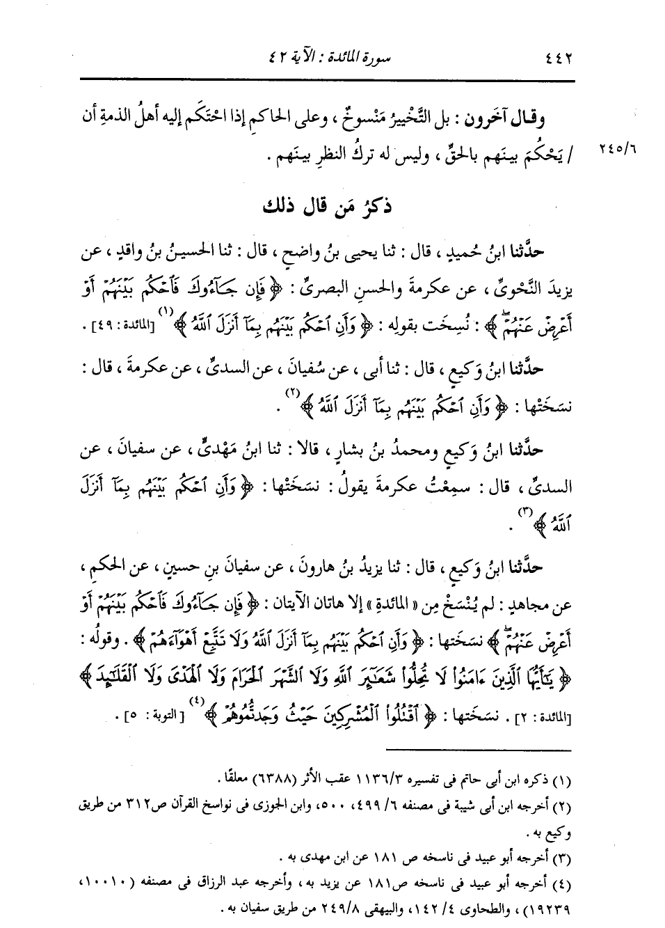 حَدَّثَنَا ابْنُ وَكِيعٍ , وَمُحَمَّدُ بْنُ بَشَّارٍ , قَالَا: ثنا ابْنُ مَهْدِيٍّ , عَنْ سُفْيَانَ , عَنِ السُّدِّيِّ , قَالَ: سَمِعْتُ عِكْرِمَةَ , يَقُولُ: نَسَخَتْهَا: {§وَأَنِ احْكُمْ بَيْنَهُمْ بِمَا أَنْزَلَ اللَّهُ} [المائدة: 49]