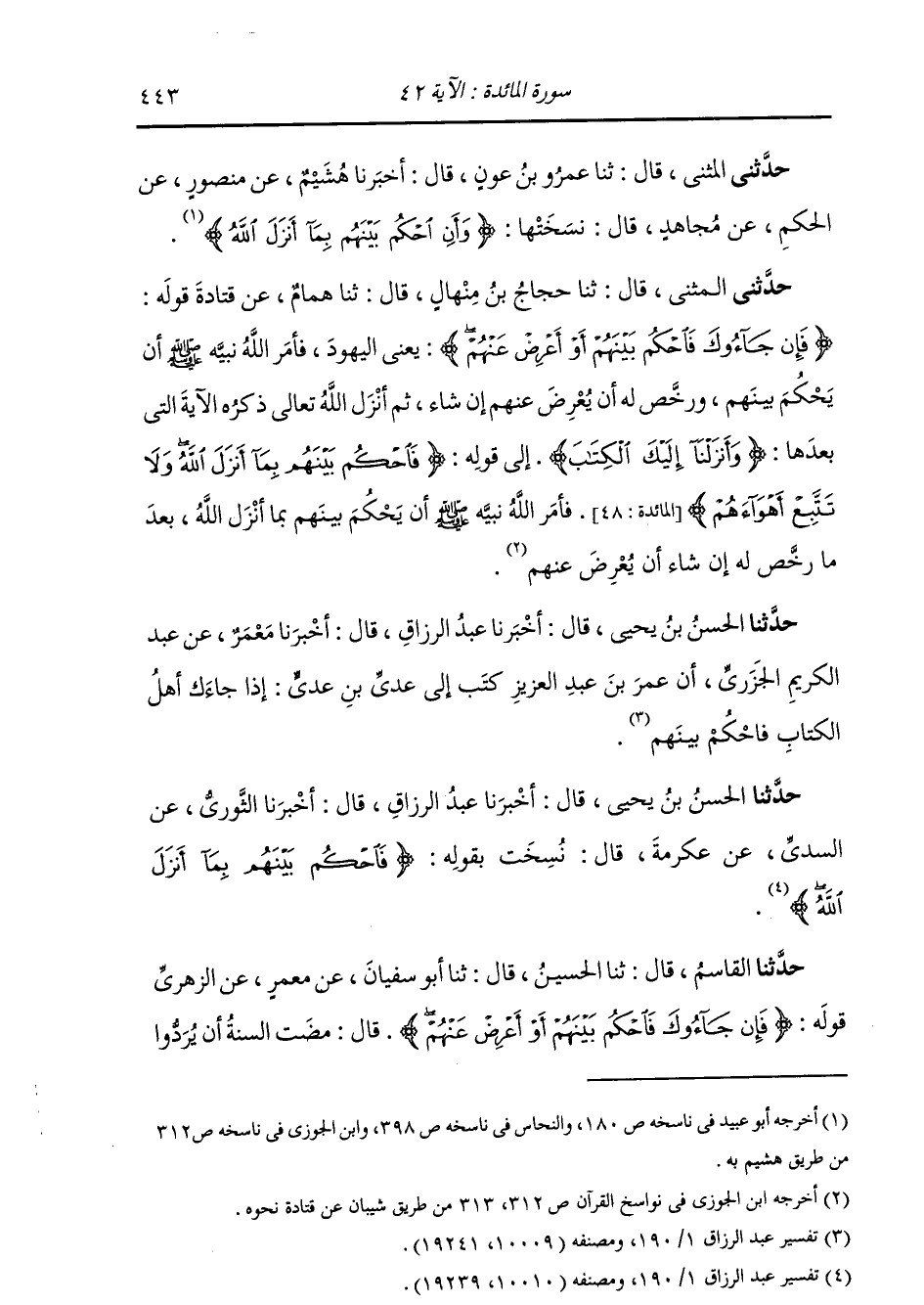 حَدَّثَنِي الْمُثَنَّى , قَالَ: ثنا حَجَّاجُ بْنُ مِنْهَالٍ , قَالَ: ثنا هَمَّامٌ , عَنْ قَتَادَةَ , قَوْلُهُ: {§فَإِنْ جَاءُوكَ فَاحْكُمْ بَيْنَهُمْ أَوْ أَعْرِضْ عَنْهُمْ} يَعْنِي الْيَهُودَ. فَأَمَرَ اللَّهُ نَبِيَّهُ صَلَّى اللهُ عَلَيْهِ وَسَلَّمَ أَنْ يَحْكُمَ بَيْنَهُمْ , وَرَخَّصَ لَهُ أَنْ يُعْرِضَ عَنْهُمْ إِنْ شَاءَ , ثُمَّ أَنْزَلَ اللَّهُ تَعَالَى الْآيَةَ الَّتِي بَعْدَهَا: {وَأَنْزَلْنَا إِلَيْكَ الْكِتَابَ} [المائدة: 48] إِلَى قَوْلِهِ: {وَأَنِ احْكُمْ بَيْنَهُمْ بِمَا أَنْزَلَ اللَّهُ وَلَا تَتَّبِعْ أَهْوَاءَهُمْ} [المائدة: 49] فَأَمَرَ اللَّهُ نَبِيَّهُ صَلَّى اللهُ عَلَيْهِ وَسَلَّمَ أَنْ يَحْكُمَ بَيْنَهُمْ بِمَا أَنْزَلَ اللَّهُ بَعْدَ مَا رَخَّصَ لَهُ إِنْ شَاءَ أَنْ يُعْرِضَ عَنْهُمْ "