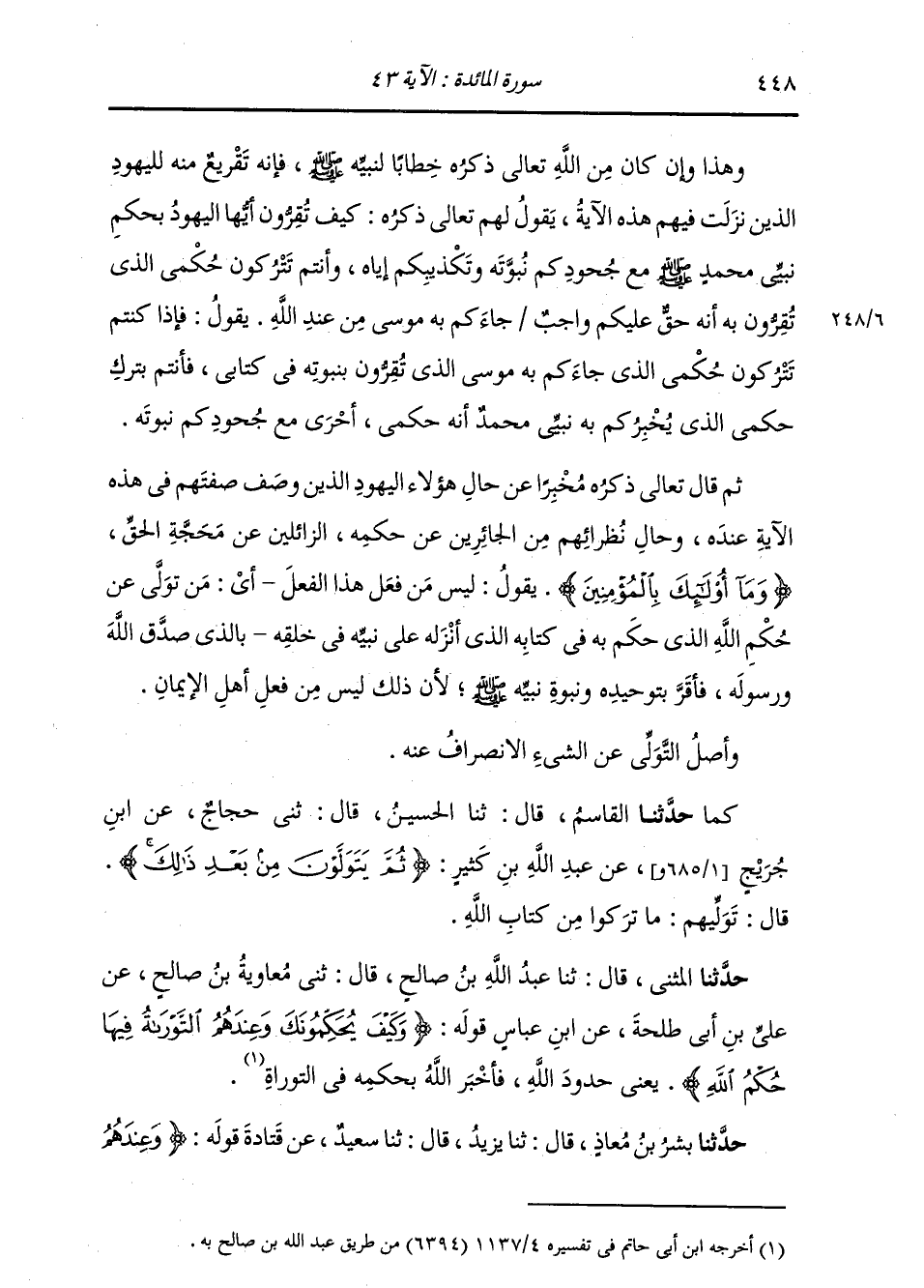 حَدَّثَنَا الْمُثَنَّى , قَالَ: ثنا عَبْدُ اللَّهِ بْنُ صَالِحٍ , قَالَ: ثني مُعَاوِيَةُ بْنُ صَالِحٍ , عَنْ عَلِيِّ بْنِ أَبِي طَلْحَةَ , عَنِ ابْنِ عَبَّاسٍ , قَوْلُهُ: {§وَكَيْفَ يُحَكِّمُونَكَ وَعِنْدَهُمُ التَّوْرَاةُ فِيهَا حُكْمُ اللَّهِ} [المائدة: 43] يَعْنِي: «حُدُودَ اللَّهِ , فَأَخْبَرَ اللَّهُ بِحُكْمِهِ فِي التَّوْرَاةِ»
