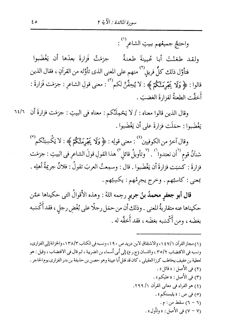 فَتَأَوَّلَ ذَلِكَ كُلُّ فَرِيقٍ مِنْهُمْ عَلَى الْمَعْنَى الَّذِي تَأَوَّلَهُ مِنَ الْقُرْآنِ , فَقَالَ الَّذِينَ قَالُوا: {لَا يَجْرِمَنَّكُمْ} [هود: 89] لَا يَحِقَّنَّ لَكُمْ مَعْنَى قَوْلِ الشَّاعِرِ: جَرَمَتْ فَزَارَةَ: أَحَقَّتِ الطَّعْنَةُ لِفَزَارَةَ الْغَضَبَ. وَقَالَ الَّذِينَ قَالُوا مَعْنَاهُ: لَا يَحْمِلَنَّكُمْ: مَعْنَاهُ فِي الْبَيْتِ: جَرَمَتْ فَزَارَةَ أَنْ يَغْضَبُوا: حَمَلَتْ فَزَارَةَ عَلَى أَنْ يَغْضَبُوا. وَقَالَ آخَرُ مِنَ الْكُوفِيِّينَ: مَعْنَى قَوْلِهِ: {لَا يَجْرِمَنَّكُمْ} [هود: 89] لَا يُكْسِبَنَّكُمْ شَنَآنُ قَوْمٍ. وَتَأْوِيلُ قَائِلِ هَذَا الْقَوْلِ قَوْلَ الشَّاعِرِ فِي الْبَيْتِ: جَرَمَتْ فَزَارَةَ: كَسَبَتْ فَزَارَةَ أَنْ يَغْضَبُوا. قَالَ: وَسَمِعْتُ الْعَرَبَ تَقُولُ: فُلَانٌ جَرِيمَةُ أَهْلِهِ , بِمَعْنَى: كَاسِبُهُمْ , وَخَرَجَ يُجْرِمُهُمْ: يُكْسِبُهُمْ. وَهَذِهِ الْأَقْوَالُ الَّتِي حَكَيْنَاهَا عَمَّنْ حَكَيْنَاهَا عَنْهُ مُتَقَارِبَةُ الْمَعْنَى؛ وَذَلِكَ أَنَّ مَنْ حَمَلَ رَجُلًا عَلَى بُغْضِ رَجُلٍ فَقَدْ أَكْسَبَهُ بُغْضَهُ , وَمَنْ أَكْسَبَهُ بُغْضَهُ فَقَدْ أَحَقَّهُ لَهُ "