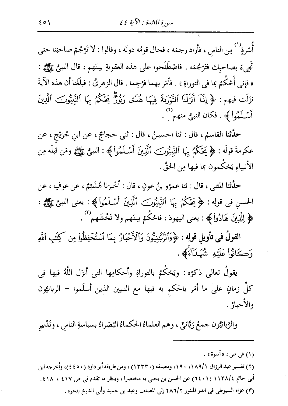 §الْقَوْلُ فِي تَأْوِيلِ قَوْلِهِ تَعَالَى: وَالرَّبَّانِيُّونَ وَالْأَحْبَارُ بِمَا اسْتُحْفِظُوا مِنْ كِتَابِ اللَّهِ وَكَانُوا عَلَيْهِ شُهَدَاءَ يَقُولُ تَعَالَى ذِكْرُهُ: وَيَحْكُمُ بِالتَّوْرَاةِ وَأَحْكَامِهَا الَّتِي أَنْزَلَ اللَّهُ فِيهَا فِي كُلِّ زَمَانٍ عَلَى مَا أَمَرَ بِالْحُكْمِ بِهِ فِيهَا مَعَ النَّبِيِّينَ الَّذِينَ أَسْلَمُوا , الرَّبَّانِيُّونَ وَالْأَحْبَارُ. وَالرَّبَّانِيُّونَ: جَمْعُ رَبَّانِيٍّ , وَهُمُ الْعُلَمَاءُ الْحُكَمَاءُ , الْبُصَرَاءُ بِسِيَاسَةِ النَّاسِ وَتَدْبِيرِ