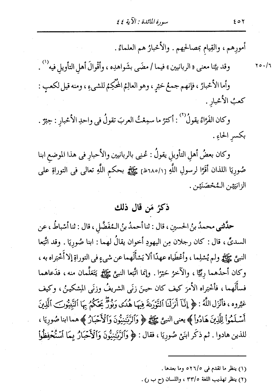 أُمُورِهِمْ وَالْقِيَامِ بَمَصَالِحِهِمْ. وَالْأَحْبَارُ: هُمُ الْعُلَمَاءُ. وَقَدْ بَيَّنَّا مَعْنَى الرَّبَّانِيِّينَ فِيمَا مَضَى بِشَوَاهِدِهِ , وَأَقْوَالَ أَهْلِ التَّأْوِيلِ فِيهِ. وَأَمَّا الْأَحْبَارُ: فَإِنَّهُمْ جَمْعُ حَبْرٍ , وَهُوَ الْعَالِمُ الْمُحْكِمُ لِلشَّيْءِ , وَمِنْهُ قِيلَ لِكَعْبٍ: كَعْبُ الْأَحْبَارِ. وَكَانَ الْفَرَّاءُ يَقُولُ: أَكْثَرُ مَا سَمِعْتُ الْعَرَبَ تَقُولُ فِي وَاحِدِ الْأَحْبَارِ: حَبْرٌ بِكَسْرِ الْحَاءِ. وَكَانَ بَعْضُ أَهْلِ التَّأْوِيلِ يَقُولُ: عُنِيَ بِالرَّبَّانِيِّينَ وَالْأَحْبَارِ فِي هَذَا الْمَوْضِعِ: ابْنَا صُورِيَا اللَّذَانِ أَقَرَّا لِرَسُولِ اللَّهِ صَلَّى اللهُ عَلَيْهِ وَسَلَّمَ بِحُكْمِ اللَّهِ تَعَالَى فِي التَّوْرَاةِ عَلَى الزَّانِيَيْنِ الْمُحْصَنَيْنِ