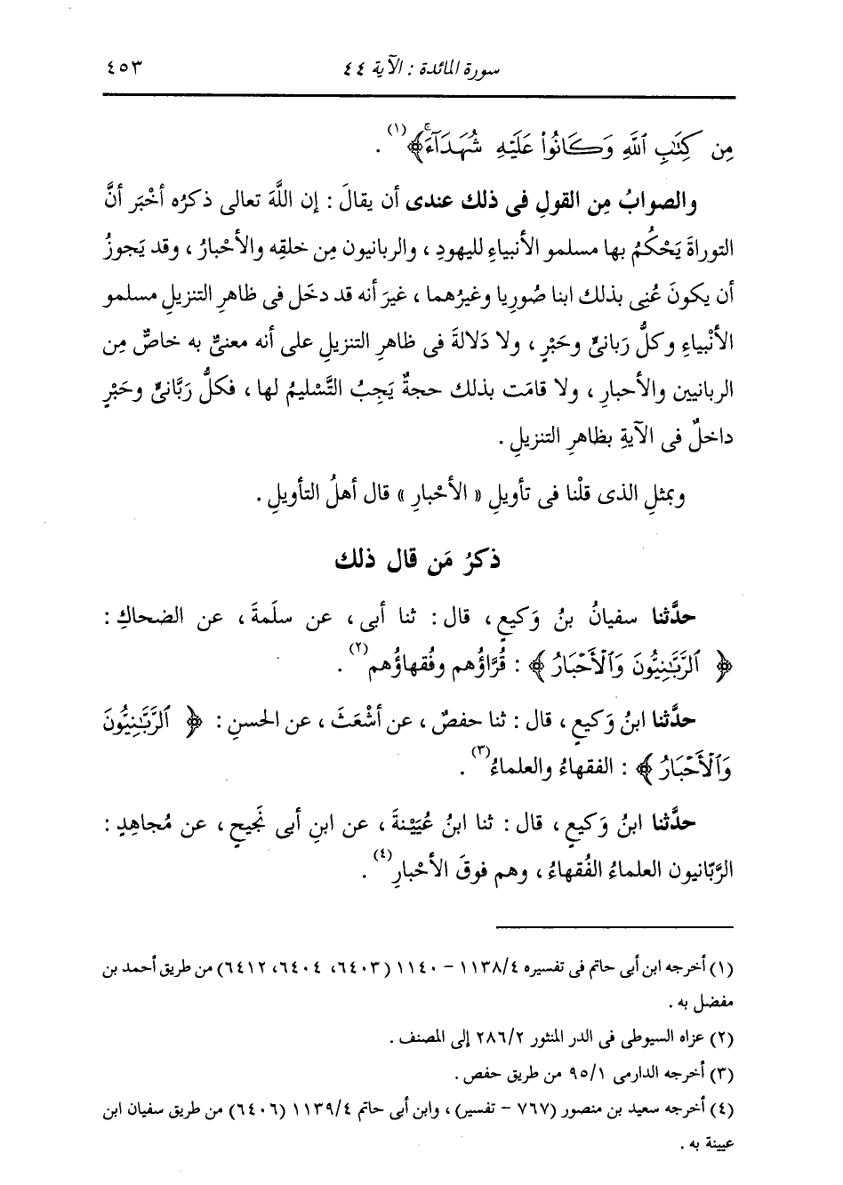 حَدَّثَنَا ابْنُ وَكِيعٍ , قَالَ: ثنا ابْنُ عُيَيْنَةَ , عَنِ ابْنِ أَبِي نَجِيحٍ , عَنْ مُجَاهِدٍ: «§الرَّبَّانِيُّونَ الْعُلَمَاءُ الْفُقَهَاءُ , وَهُمْ فَوْقَ الْأَحْبَارِ»