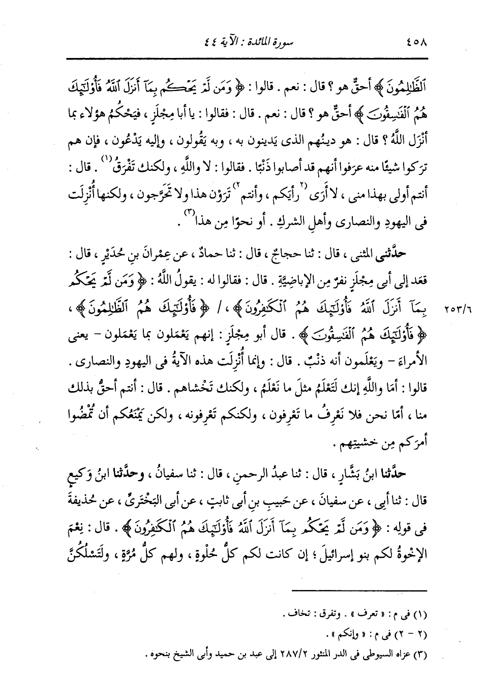 حَدَّثَنِي الْمُثَنَّى , قَالَ: ثنا حَجَّاجٌ , قَالَ: ثنا حَمَّادٌ , عَنْ عِمْرَانَ بْنِ حُدَيْرٍ , قَالَ: قَعَدَ إِلَى أَبِي مِجْلَزٍ نَفَرٌ مِنَ الْإِبَاضِيَّةِ , قَالَ: فَقَالُوا لَهُ: يَقُولُ اللَّهُ: {§وَمَنْ لَمْ يَحْكُمْ بِمَا أَنْزَلَ اللَّهُ فَأُولَئِكَ هُمُ الْكَافِرُونَ} [المائدة: 44] , {فَأُولَئِكَ هُمُ الظَّالِمُونَ} [البقرة: 229] , {فَأُولَئِكَ هُمُ الْفَاسِقُونَ} [آل عمران: 82] قَالَ أَبُو مِجْلَزٍ: إِنَّهُمْ يَعْمَلُونَ مَا يَعْمَلُونَ , يَعْنِي الْأَمَرَاءَ , وَيَعْلَمُونَ أَنَّهُ ذَنْبٌ. قَالَ: وَإِنَّمَا أُنْزِلَتْ هَذِهِ الْآيَةُ فِي الْيَهُودِ وَالنَّصَارَى. قَالُوا: أَمَا وَاللَّهِ إِنَّكَ لَتَعْلَمُ مِثْلَ مَا نَعْلَمُ , وَلَكِنَّكَ تَخْشَاهُمْ. قَالَ: أَنْتُمْ أَحَقُّ بِذَلِكَ مِنَّا , أَمَّا نَحْنُ فَلَا نَعْرِفُ مَا تَعْرِفُونَ وَلَكِنَّكُمْ تَعْرِفُونَهُ , وَلَكِنْ يَمْنَعُكُمْ أَنْ تُمْضُوا أَمْرَكُمْ مِنْ خَشْيَتِهِمْ "