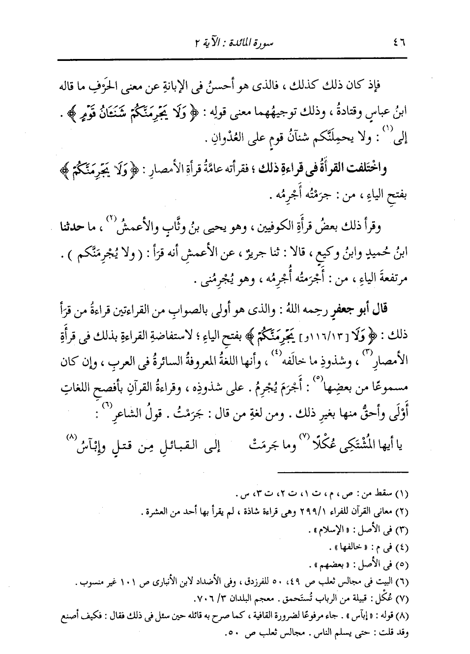 فَإِذَا كَانَ ذَلِكَ كَذَلِكَ , فَالَّذِي هُوَ أَحْسَنُ فِي الْإِبَانَةِ عَنْ مَعْنَى الْحَرْفِ , مَا قَالَهُ ابْنُ عَبَّاسٍ وَقَتَادَةُ , وَذَلِكَ تَوْجِيهُهُمَا مَعْنَى قَوْلِهِ: {وَلَا يَجْرِمَنَّكُمْ شَنَآنُ قَوْمٍ} [المائدة: 2] وَلَا يَحْمِلَنَّكُمْ شَنَآنُ قَوْمٍ عَلَى الْعُدْوَانِ " وَاخْتَلَفَتِ الْقُرَّاءَ فِي قِرَاءَةِ ذَلِكَ , فَقَرَأَتْهُ عَامَّةُ قُرَّاءِ الْأَمْصَارِ: {وَلَا يَجْرِمَنَّكُمْ} [المائدة: 2] بِفَتْحِ الْيَاءِ مِنْ جَرَمْتُهُ أَجْرِمُهُ. وَقَرَأَ ذَلِكَ بَعْضُ قُرَّاءِ الْكُوفِيِّينَ , وَهُوَ يَحْيَى بْنُ وَثَّابٍ وَالْأَعْمَشُ , مَا: