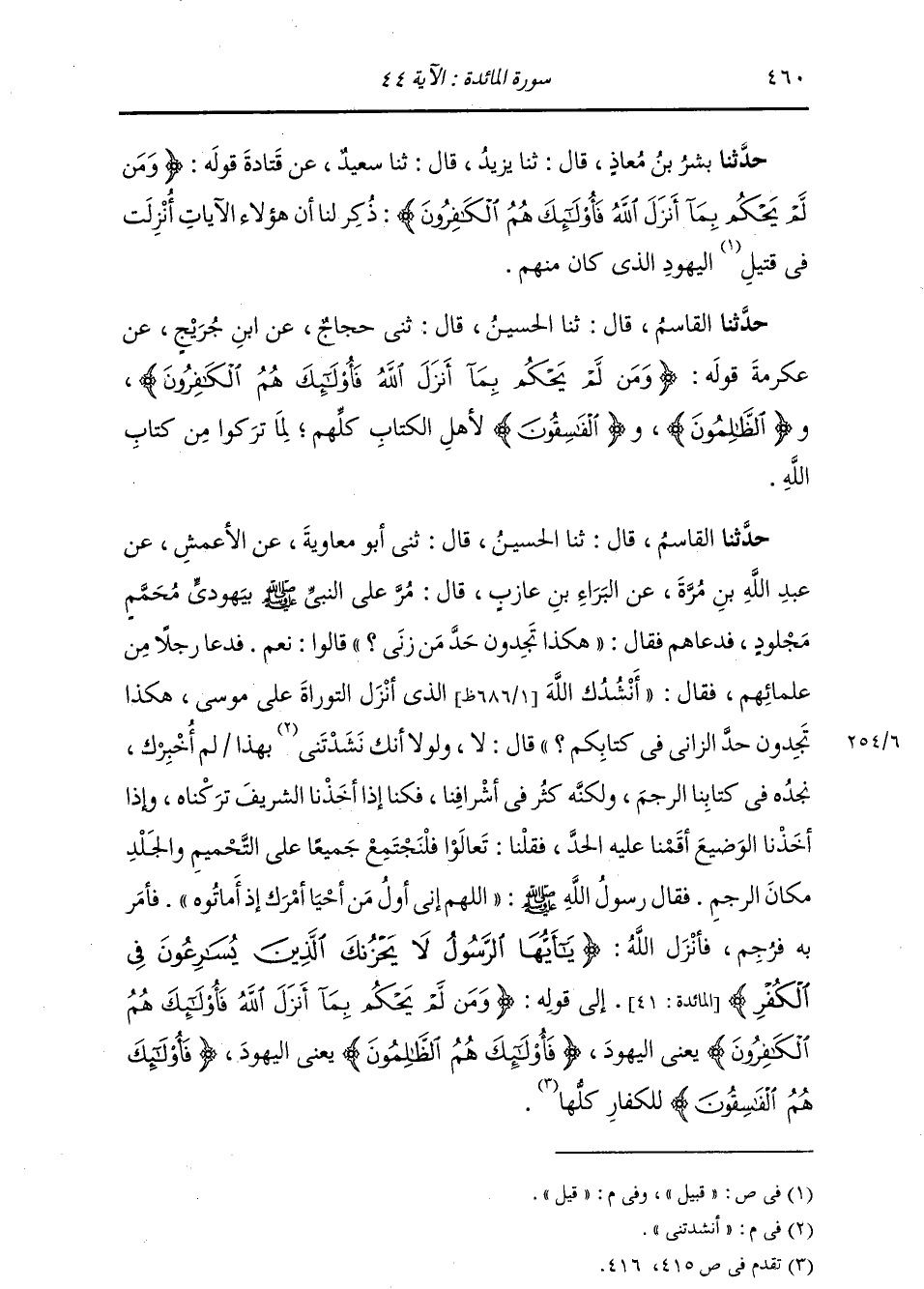 حَدَّثَنَا الْقَاسِمُ , قَالَ: ثنا الْحُسَيْنُ , قَالَ: ثني أَبُو مُعَاوِيَةَ , عَنِ الْأَعْمَشِ , عَنْ عَبْدِ اللَّهِ بْنِ مُرَّةَ , عَنِ الْبَرَاءِ بْنِ عَازِبٍ , قَالَ: مُرَّ عَلَى النَّبِيِّ صَلَّى اللهُ عَلَيْهِ وَسَلَّمَ بِيَهُودِيٍّ مُحَمَّمٍ مَجْلُودٍ , فَدَعَاهُمْ فَقَالَ: «هَكَذَا تَجِدُونَ حَدَّ مَنْ زَنَى؟» قَالُوا: نَعَمْ. فَدَعَا رَجُلًا مِنْ عُلَمَائِهِمْ , فَقَالَ: «أَنْشُدُكَ اللَّهَ الَّذِي أَنْزَلَ التَّوْرَاةَ عَلَى مُوسَى , هَكَذَا تَجِدُونَ حَدَّ الزَّانِي فِي كِتَابِكُمْ؟» قَالَ: لَا , وَلَوْلَا أَنَّكَ أَنْشَدْتَنِي بِهَذَا لَمْ أُخْبِرْكَ , نَجِدُ حَدَّهُ فِي كِتَابِنَا الرَّجْمَ , وَلَكِنَّهُ كَثُرَ فِي أَشْرَافِنَا , فَكُنَّا إِذَا أَخَذْنَا الشَّرِيفَ تَرَكْنَاهُ وَإِذَا أَخَذْنَا الْوَضِيعَ أَقَمْنَا عَلَيْهِ الْحَدَّ , فَقُلْنَا تَعَالَوْا فَلْنَجْتَمِعْ جَمِيعًا عَلَى التَّحْمِيمِ وَالْجَلْدِ مَكَانَ الرَّجْمِ. فَقَالَ رَسُولُ اللَّهِ صَلَّى اللهُ عَلَيْهِ وَسَلَّمَ: «اللَّهُمَّ إِنِّي أَوَّلُ مَنْ أَحْيَا أَمْرَكَ إِذْ أَمَاتُوهُ» فَأَمَرَ بِهِ فَرُجِمَ , فَأَنْزَلَ اللَّهُ: {§يَا أَيُّهَا الرَّسُولُ لَا يَحْزُنْكَ الَّذِينَ يُسَارِعُونَ فِي الْكُفْرِ} [المائدة: 41] إِلَى قَوْلِهِ: {وَمَنْ لَمْ يَحْكُمْ بِمَا أَنْزَلَ اللَّهُ فَأُولَئِكَ هُمُ الْكَافِرُونَ} [المائدة: 44] يَعْنِي الْيَهُودَ {فَأُولَئِكَ هُمُ الظَّالِمُونَ} [البقرة: 229] يَعْنِي الْيَهُودَ , {فَأُولَئِكَ هُمُ الْفَاسِقُونَ} [آل عمران: 82] لِلْكُفَّارِ كُلِّهَا "