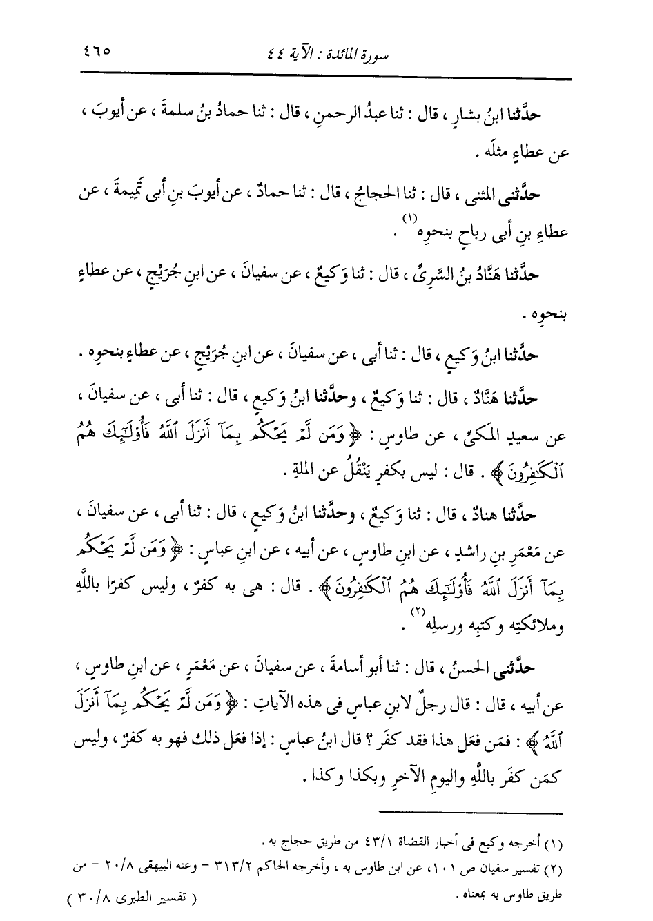 حَدَّثَنَا هَنَّادٌ , قَالَ: ثنا وَكِيعٌ , وَحَدَّثَنَا ابْنُ وَكِيعٍ , قَالَ: ثنا أَبِي , عَنْ سُفْيَانَ , عَنْ سَعِيدٍ الْمَكِّيِّ , عَنْ طَاوُسٍ: {§وَمَنْ لَمْ يَحْكُمْ بِمَا أَنْزَلَ اللَّهُ فَأُولَئِكَ هُمُ الْكَافِرُونَ} [المائدة: 44] قَالَ: «لَيْسَ بِكُفْرٍ يَنْقُلُ عَنِ الْمِلَّةِ»