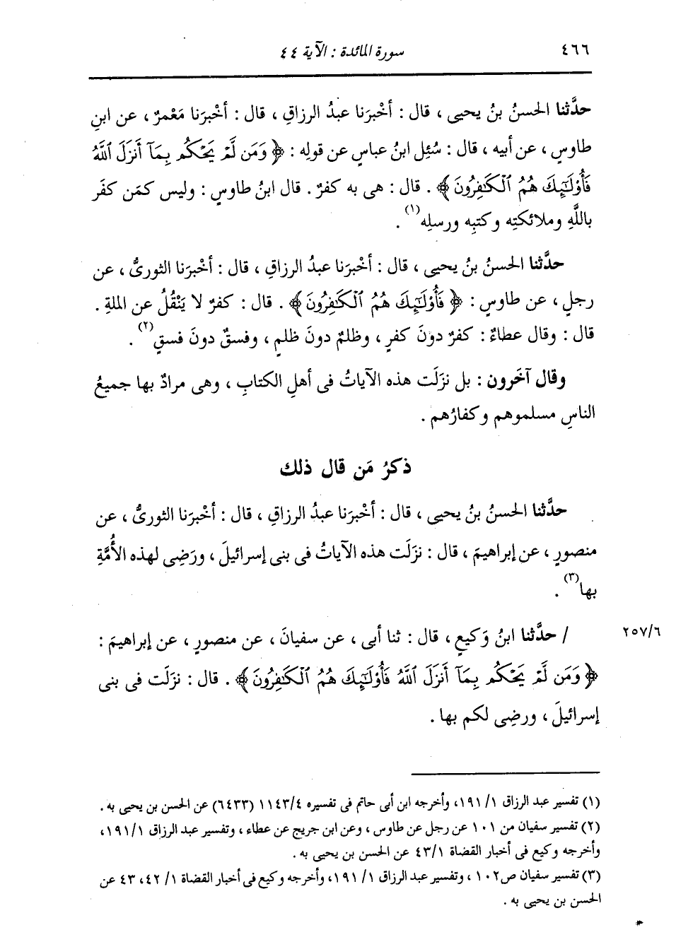 حَدَّثَنَا الْحَسَنُ بْنُ يَحْيَى , قَالَ: أَخْبَرَنَا عَبْدُ الرَّزَّاقِ , قَالَ: أَخْبَرَنَا الثَّوْرِيُّ , عَنْ رَجُلٍ , عَنْ طَاوُسٍ: {§فَأُولَئِكَ هُمُ الْكَافِرُونَ} [المائدة: 44] قَالَ: " كُفْرٌ لَا يَنْقُلُ عَنِ الْمِلَّةِ. قَالَ: وَقَالَ عَطَاءٌ: كُفْرٌ دُونَ كُفْرٌ , وَظُلْمٌ دُونَ ظُلْمٍ , وَفِسْقٌ دُونَ فِسْقٍ " وَقَالَ آخَرُونَ: بَلْ نَزَلَتْ هَذِهِ الْآيَاتُ فِي أَهْلِ الْكِتَابِ , وَهَى مُرَادٌ بِهَا جَمِيعُ النَّاسِ مُسْلِمُوهُمْ وَكُفَّارُهُمْ