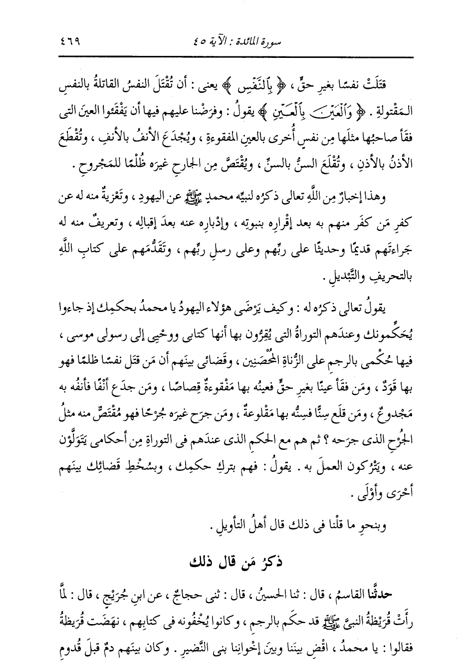 قَتَلَتْ نَفْسًا بِغَيْرِ حَقٍّ بِالنَّفْسِ , يَعْنِي: أَنْ تُقْتَلَ النَّفْسُ الْقَاتِلَةُ بِالنَّفْسِ الْمَقْتُولَةِ {وَالْعَيْنَ بِالْعَيْنِ} [المائدة: 45] يَقُولُ: " وَفَرَضْنَا عَلَيْهِمْ فِيهَا أَنْ يَفْقَئُوا الْعَيْنَ الَّتِي فَقَأَ صَاحِبُهَا مِثْلَهَا مِنْ نَفْسٍ أُخْرَى بِالْعَيْنِ الْمَفْقُوءَةِ , وَيَجْدَعَ الْأَنْفَ بِالْأَنْفِ , وَيَقْطَعَ الْأُذُنَ بِالْأُذُنِ , وَيَقْلَعَ السِّنَّ بِالسِّنِّ , وَيَقْتَصَّ مِنَ الْجَارِحِ غَيْرَهُ ظُلْمًا لِلْمَجْرُوحِ. وَهَذَا إِخْبَارٌ مِنَ اللَّهِ تَعَالَى ذِكْرُهُ لِنَبِيِّهِ مُحَمَّدٍ صَلَّى اللهُ عَلَيْهِ وَسَلَّمَ عَنِ الْيَهُودِ , وَتَعْزِيَةٌ مِنْهُ لَهُ عَنْ كُفْرِ مَنْ كَفَرَ مِنْهُمْ بِهِ بَعْدَ إِقْرَارِهِ بِنُبُوَّتِهِ وَإِدْبَارِهِ عَنْهُ بَعْدَ إِقْبَالِهِ , وَتَعْرِيفٌ مِنْهُ لَهُ جَرَاءَتَهُمْ قَدِيمًا وَحَدِيثًا عَلَى رَبِّهِمْ وَعَلَى رُسُلِ رَبِّهِمْ وَتَقَدُّمِهِمْ عَلَى كِتَابِ اللَّهِ بِالتَّحْرِيفِ وَالتَّبْدِيلِ؛ يَقُولُ تَعَالَى ذِكْرُهُ لَهُ: وَكَيْفَ يَرْضَى هَؤُلَاءِ الْيَهُودُ يَا مُحَمَّدُ بِحُكْمِكَ إِذَا جَاءُوا يُحَكِّمُونَكَ وَعِنْدَهُمُ التَّوْرَاةُ الَّتِي يُقِرُّونَ بِهَا أَنَّهَا كِتَابِي وَوَحْيِي إِلَى رَسُولِي مُوسَى صَلَّى اللهُ عَلَيْهِ وَسَلَّمَ فِيهَا حُكْمِي بِالرَّجْمِ عَلَى الزُّنَاةِ الْمُحْصَنِينَ , وَقَضَائِي بَيْنَهُمْ أَنَّ مَنْ قَتَلَ نَفْسًا ظُلْمًا فَهُوَ بِهَا قَوَدٌ , وَمَنْ فَقَأَ عَيْنًا بِغَيْرِ حَقٍّ فَعَيْنُهُ بِهَا مَفْقُوءَةٌ قِصَاصًا , وَمَنْ جَدَعَ أَنْفًا فَأَنْفُهُ بِهِ مَجْدُوعٌ , وَمَنْ قَلَعَ سِنًّا فَسِنُّهُ بِهَا مَقْلُوعَةٌ , وَمَنْ جَرَحَ غَيْرَهُ جُرْحًا فَهُوَ مُقْتَصٌّ مِنْهُ مِثْلَ الْجُرْحِ الَّذِي جَرَحَهُ , ثُمَّ هُمْ مَعَ الْحُكْمِ الَّذِي عِنْدَهُ فِي التَّوْرَاةِ مِنْ أَحْكَامِي يَتَوَلَّوْنَ عَنْهُ وَيَتْرُكُونَ الْعَمَلَ بِهِ؛ يَقُولُ: فَهُمْ بِتَرْكِ حُكْمِكَ وَبِسَخَطِ قَضَائِكَ بَيْنَهُمْ أَحْرَى وَأَوْلَى. وَبِنَحْوِ مَا قُلْنَا فِي ذَلِكَ قَالَ أَهْلُ التَّأْوِيلِ