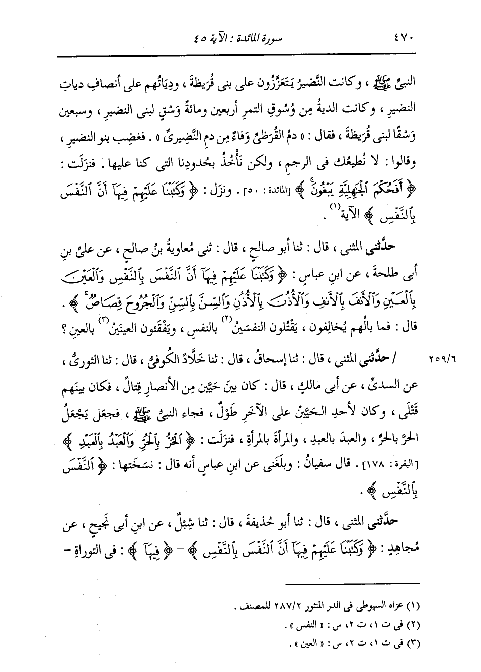 حَدَّثَنِي الْمُثَنَّى , قَالَ: ثنا أَبُو صَالِحٍ , قَالَ: ثني مُعَاوِيَةُ بْنُ صَالِحٍ , عَنْ عَلِيِّ بْنِ أَبِي طَلْحَةَ , عَنِ ابْنِ عَبَّاسٍ: {§وَكَتَبْنَا عَلَيْهِمْ فِيهَا أَنَّ النَّفْسَ بِالنَّفْسِ وَالْعَيْنَ بِالْعَيْنِ وَالْأَنْفَ بِالْأَنْفِ وَالْأُذُنَ بِالْأُذُنِ وَالسِّنَّ بِالسِّنِّ وَالْجُرُوحَ قِصَاصٌ} [المائدة: 45] قَالَ: " فَمَا بَالُهُمْ يُخَالِفُونَ , يَقْتُلُونَ النَّفْسَيْنِ بِالنَّفْسِ , وَيَفْقَئُونَ الْعَيْنَيْنِ بِالْعَيْنِ؟