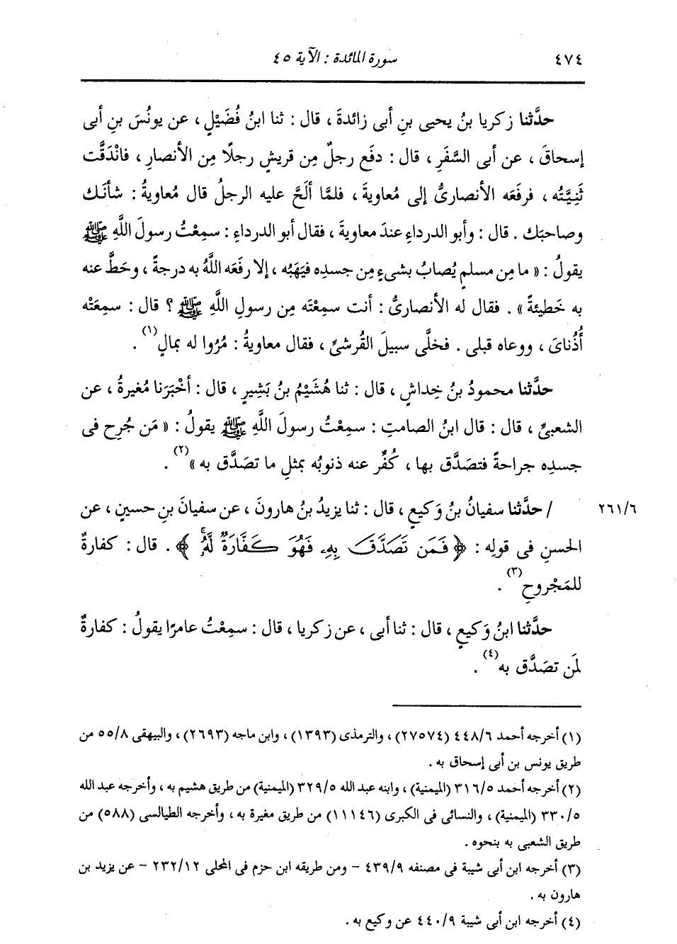 حَدَّثَنَا زَكَرِيَّا بْنُ يَحْيَى بْنِ أَبِي زَائِدَةَ , قَالَ: ثنا ابْنُ فُضَيْلٍ , عَنْ يُونُسَ بْنِ أَبِي إِسْحَاقَ , عَنْ أَبِي السَّفَرِ , قَالَ: دَفَعَ رَجُلٌ مِنْ قُرَيْشٍ رَجُلًا مِنَ الْأَنْصَارِ , فَانْدَقَّتْ ثَنِيَّتُهُ , فَرَفَعَهُ الْأَنْصَارِيُّ إِلَى مُعَاوِيَةَ. فَلَمَّا أَلَحَّ عَلَيْهِ الرَّجُلُ , قَالَ مُعَاوِيَةُ: شَأْنُكَ وَصَاحِبُكَ. قَالَ: وَأَبُو الدَّرْدَاءِ عِنْدَ مُعَاوِيَةَ , فَقَالَ أَبُو الدَّرْدَاءِ: سَمِعْتُ رَسُولَ اللَّهِ صَلَّى اللهُ عَلَيْهِ وَسَلَّمَ يَقُولُ: «§مَا مِنْ مُسْلِمٍ يُصَابُ بِشَيْءٍ مِنْ جَسَدِهِ فَيَهَبُهُ إِلَّا رَفَعَهُ اللَّهُ بِهِ دَرَجَةً وَحَطَّ عَنْهُ بِهِ خَطِيئَةً» . فَقَالَ لَهُ الْأَنْصَارِيُّ: أَنْتَ سَمِعْتَهُ مِنْ رَسُولِ اللَّهِ صَلَّى اللهُ عَلَيْهِ وَسَلَّمَ؟ قَالَ: سَمِعَتْهُ أُذُنَايَ وَوَعَاهُ قَلْبِي. فَخَلَّى سَبِيلَ الْقُرَشِيِّ , فَقَالَ مُعَاوِيَةُ: مُرُوا لَهُ بِمَالٍ "