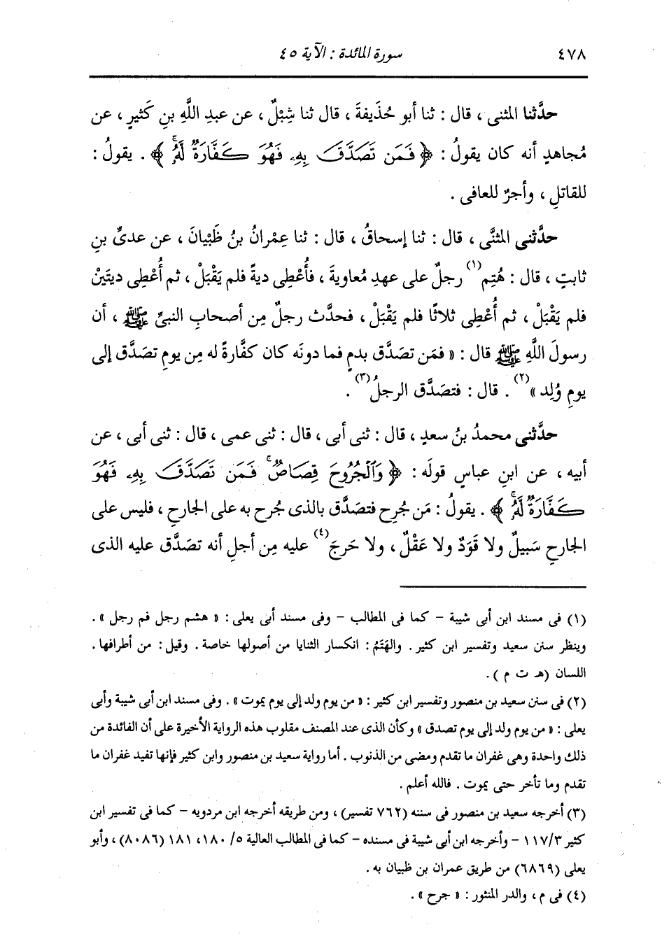 حَدَّثَنِي الْمُثَنَّى , قَالَ: ثنا إِسْحَاقُ , قَالَ: ثنا عِمْرَانُ بْنُ ظَبْيَانَ , عَنْ عَدِيِّ بْنِ ثَابِتٍ قَالَ: هُتِمَ رَجُلٌ عَلَى عَهْدِ مُعَاوِيَةَ , فَأُعْطِيَ دِيَةً فَلَمْ يَقْبَلْ , ثُمَّ أُعْطِيَ دِيَتَيْنِ فَلَمْ يَقْبَلْ , ثُمَّ أُعْطِيَ ثَلَاثًا فَلَمْ يَقْبَلْ. فحَدَّثَ رَجُلٌ مِنْ أَصْحَابِ النَّبِيِّ صَلَّى اللهُ عَلَيْهِ وَسَلَّمَ أَنَّ رَسُولَ اللَّهِ صَلَّى اللهُ عَلَيْهِ وَسَلَّمَ , قَالَ: «§فَمَنْ تَصَدَّقَ بِدَمٍ فَمَا دُونَهُ , كَانَ كَفَّارَةً لَهُ مِنْ يَوْمِ تَصَدَّقَ إِلَى يَوْمِ وُلِدَ» قَالَ: فَتَصَدَّقَ الرَّجُلُ "