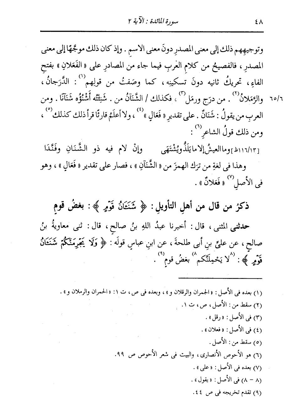 وَتَوْجِيهُهُمْ ذَلِكَ إِلَى مَعْنَى الْمَصْدَرِ دُونَ مَعْنَى الِاسْمِ. وَإِذْ كَانَ ذَلِكَ مُوَجَّهًا إِلَى مَعْنَى الْمَصْدَرِ , فَالْفَصِيحُ مِنْ كَلَامِ الْعَرَبِ فِيمَا جَاءَ مِنَ الْمَصَادِرِ عَلَى الْفَعَلَانِ بِفَتْحِ الْفَاءِ تَحْرِيكُ ثَانِيهِ دُونَ تَسْكِينِهِ , كَمَا وَصَفْتُ مِنْ قَوْلِهِمُ: الدَّرَجَانُ , وَالرَّمَلَانُ مِنْ دَرَجِ وَرَمَلَ , فَكَذَلِكَ الشَّنَآنُ مِنْ شَنَئْتُهُ أَشْنُؤُهُ شَنَآنًا. وَمِنَ الْعَربِ مَنْ يَقُولُ: شَنَانٌ عَلَى تَقْدِيرِ فَعَالٍ , وَلَا أَعْلَمُ قَارِئًا قَرَأَ ذَلِكَ كَذَلِكَ , وَمِنْ ذَلِكَ قَوْلُ الشَّاعِرِ: