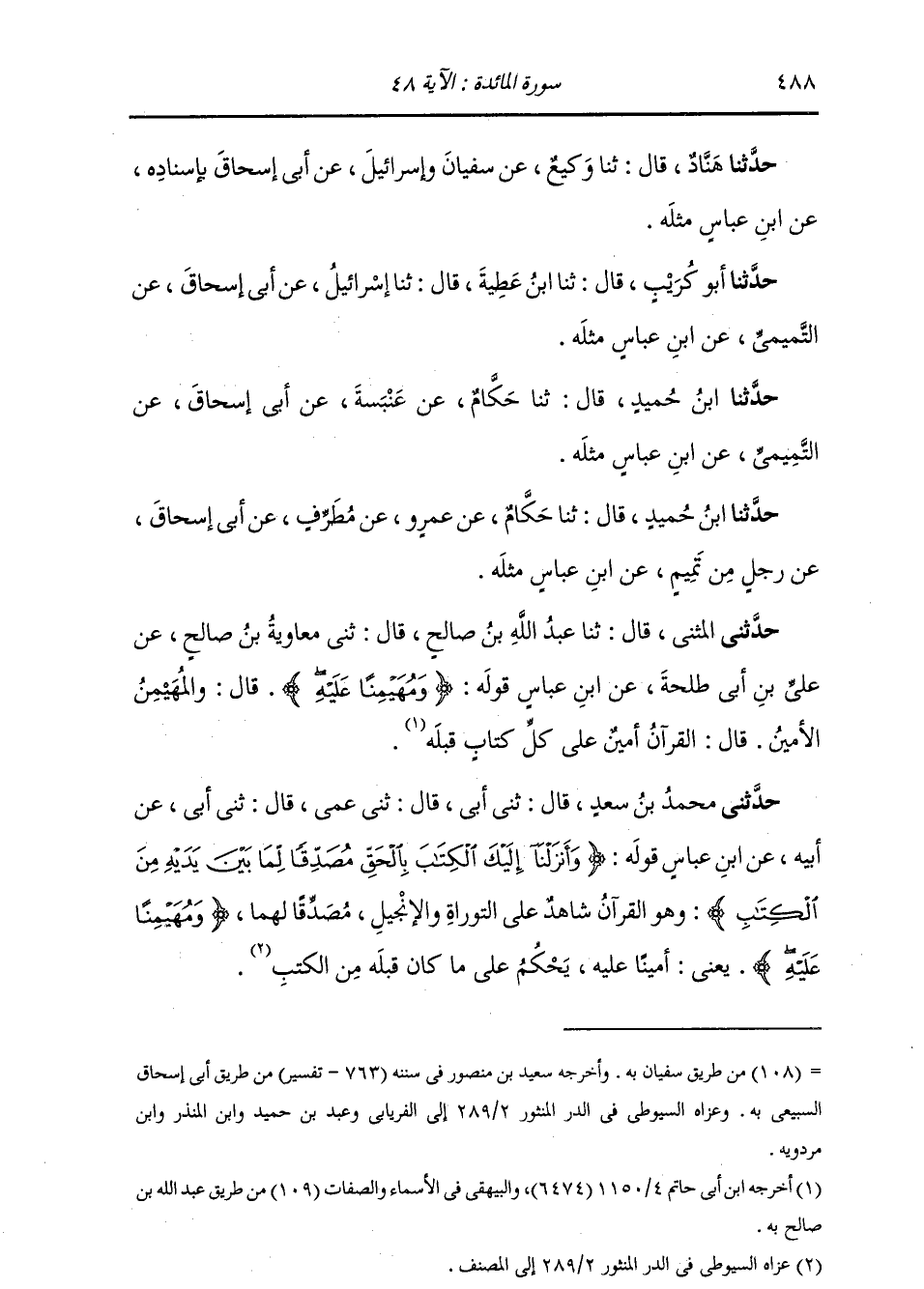 حَدَّثَنِي الْمُثَنَّى , قَالَ: ثنا عَبْدُ اللَّهِ بْنُ صَالِحٍ , قَالَ: ثني مُعَاوِيَةُ بْنُ صَالِحٍ , عَنْ عَلِيِّ بْنِ أَبِي طَلْحَةَ , عَنِ ابْنِ عَبَّاسٍ , قَوْلُهُ: {§وَمُهَيْمِنًا عَلَيْهِ} [المائدة: 48] قَالَ: " وَالْمُهَيْمِنُ: الْأَمِينُ , قَالَ: الْقُرْآنُ أَمِينٌ عَلَى كُلِّ كِتَابٍ قَبْلَهُ "