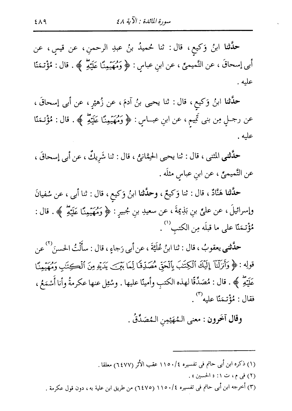 حَدَّثَنَا هَنَّادٌ , قَالَ: ثنا وَكِيعٌ , وَحَدَّثَنَا ابْنُ وَكِيعٍ , قَالَ: ثنا أَبِي , عَنْ سُفْيَانَ , وَإِسْرَائِيلَ , عَنْ عَلِيِّ بْنِ بَذِيمَةَ , عَنْ سَعِيدِ بْنِ جُبَيْرٍ: {§وَمُهَيْمِنًا عَلَيْهِ} [المائدة: 48] قَالَ: «مُؤْتَمَنًا عَلَى مَا قَبْلَهُ مِنَ الْكُتُبِ»